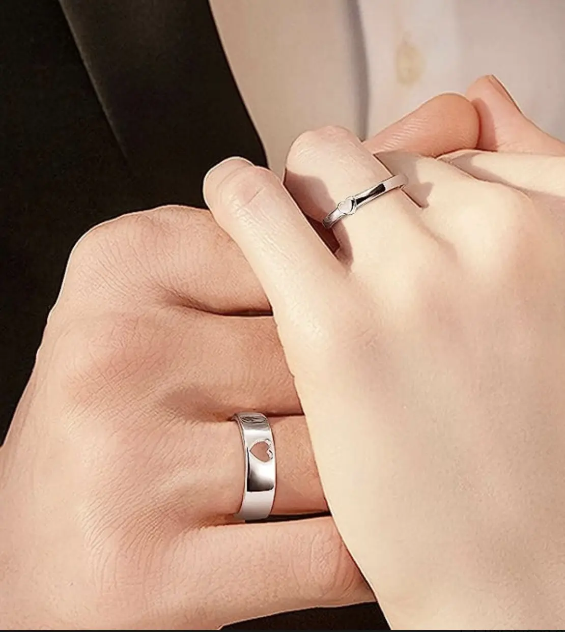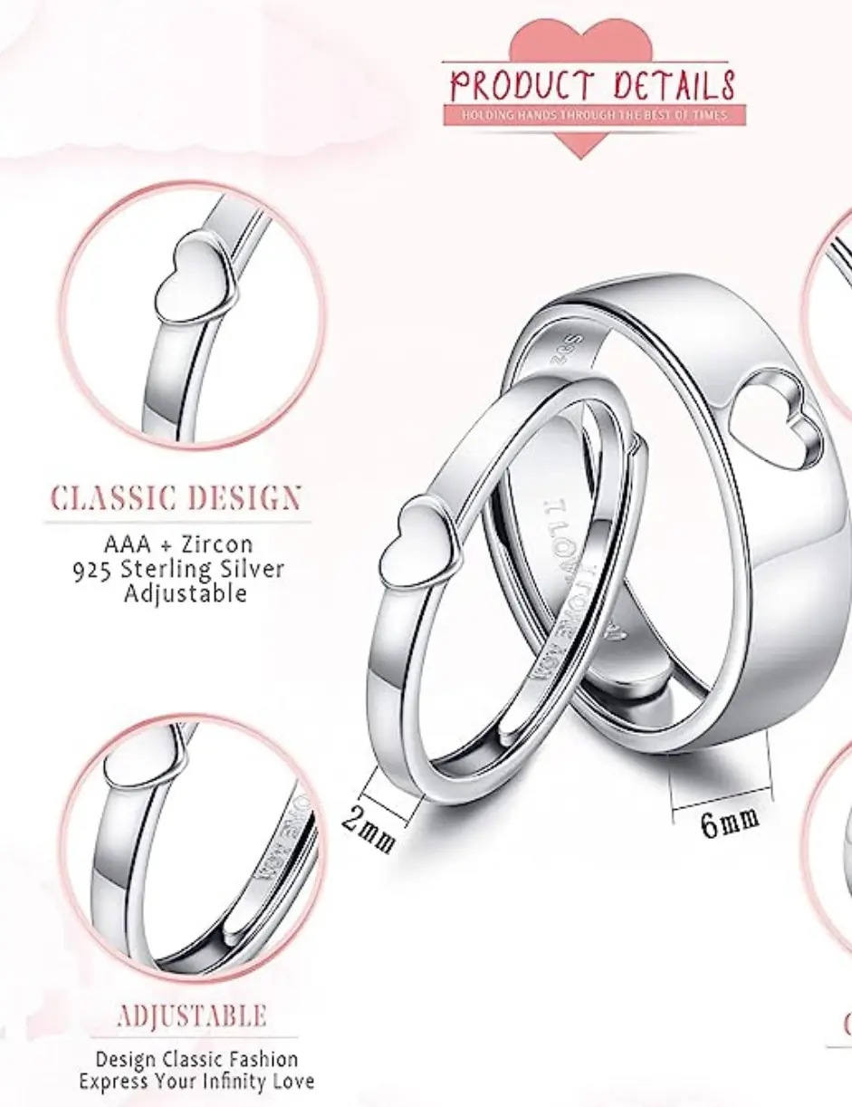 ·Sterling Silver Set: This set includes two rings crafted from sterling silver. Perfect for couples who want to bond over timeless elegance. Both rings feature a heart design, symbolizing love and unity.