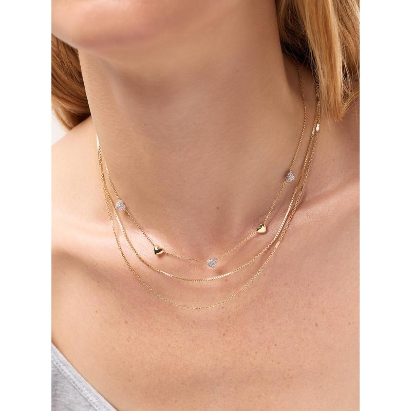 This heart necklace is here to take your neckline up a level or two. Plated in 14k gold, this station necklace features alternating polished hearts and sparkly pavé hearts for an elevated finishing touch. Whether you wear it on its own or layer it with your favorite pieces, this necklace is one you’ll reach for over and over again. Style this piece with our Giulia hoops for any occasion.
