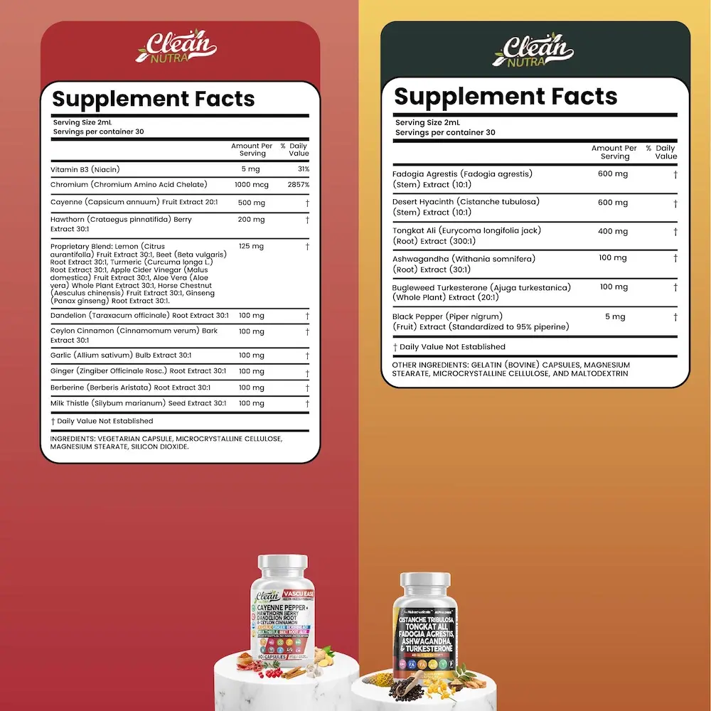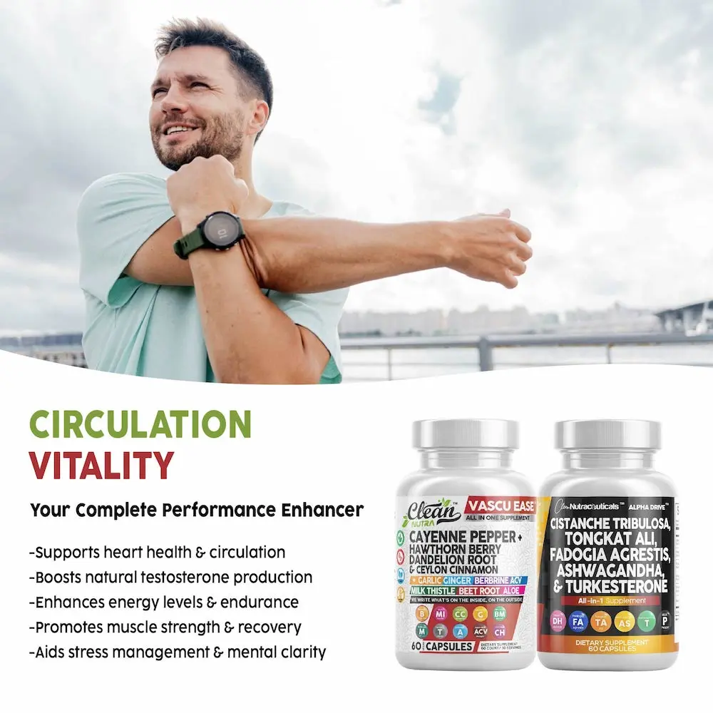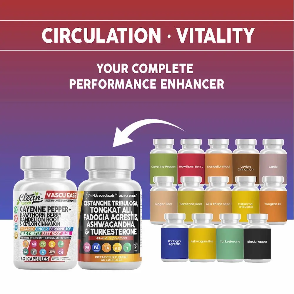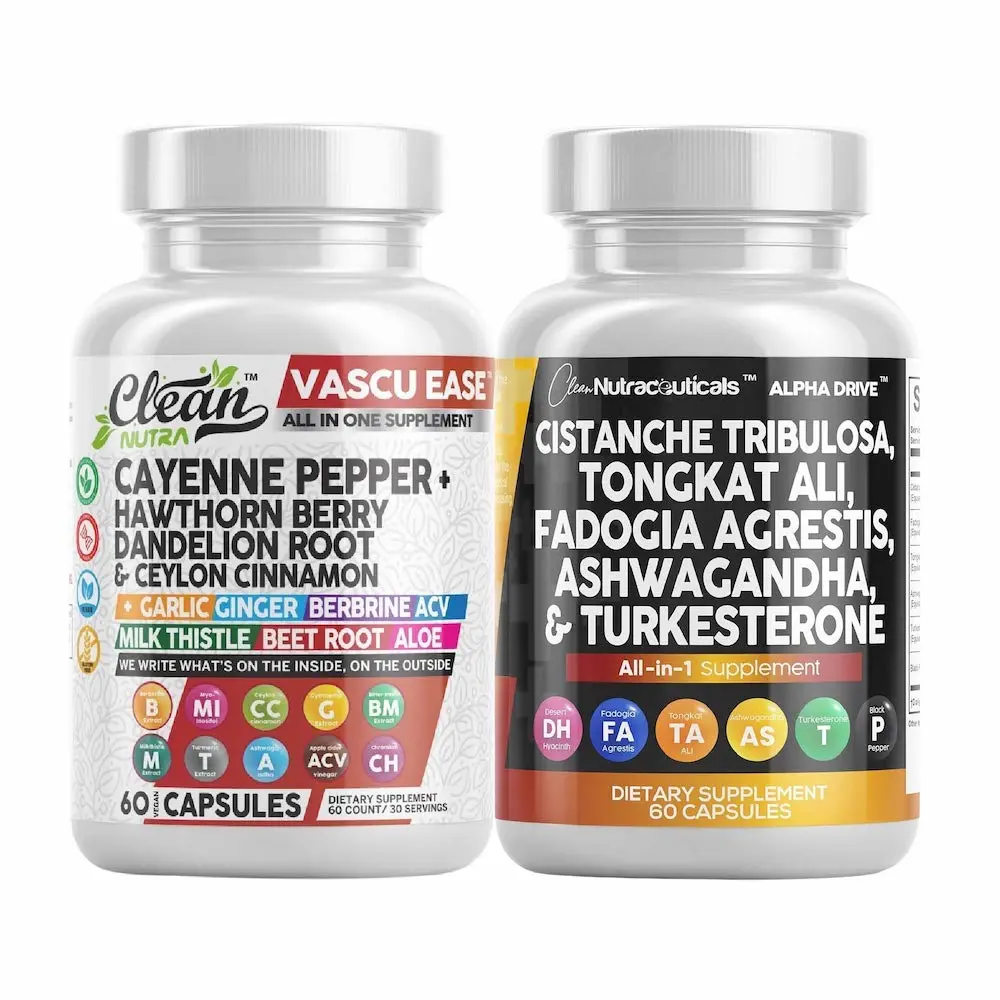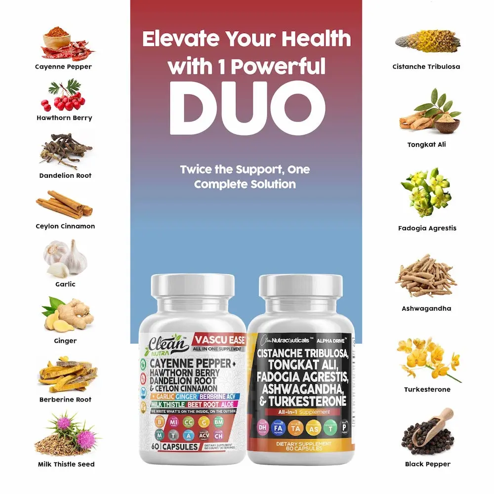 Unleash your full potential with the Clean Nutra Heart & Performance Duo — a powerful capsule-based stack designed to fuel circulation, stamina, and overall performance. Featuring Vascu Ease to support heart health and blood flow, paired with Alpha Drive, a male-focused formula with adaptogens and performance-enhancing botanicals, this duo delivers total-body vitality.