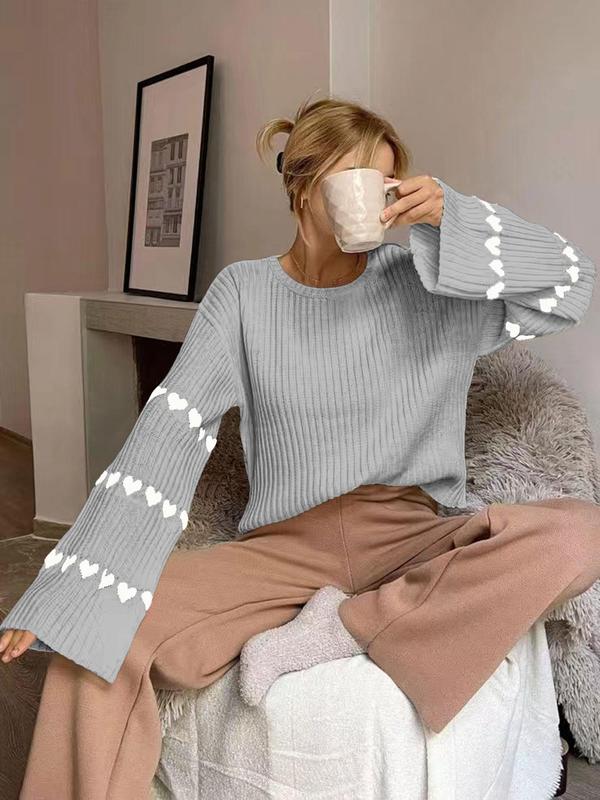 Women's Colorblock Heart Print Drop Shoulder Sweater, Casual Long Sleeve Round Neck Jumper for Fall & Winter, Fashion Ladies' Knitwear for Daily Wear