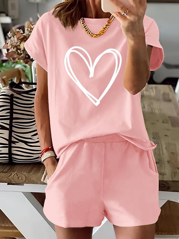 5. Two-Piece Set Women's Heart Print Tee & Shorts, Casual Shortsleeve Fitted T-shirt & Shorts for Daily Wear, Ladies Two-piece Matching Lounge Sets for Spring & Fall, Clothes