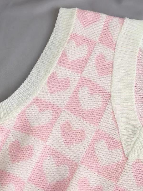 Women's Heart Print V Neck Sweater Vest, Casual Comfy Sleeveless Knit Top for Daily Outdoor Wear, Women Knitwear for Spring & Fall