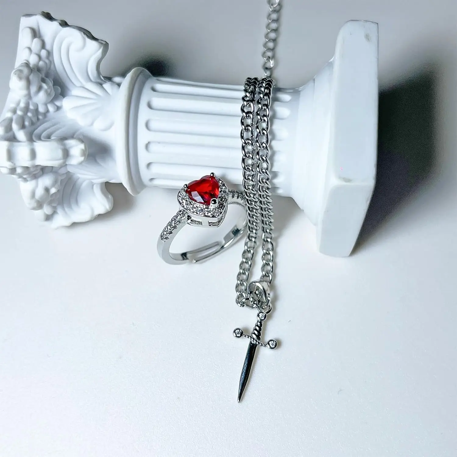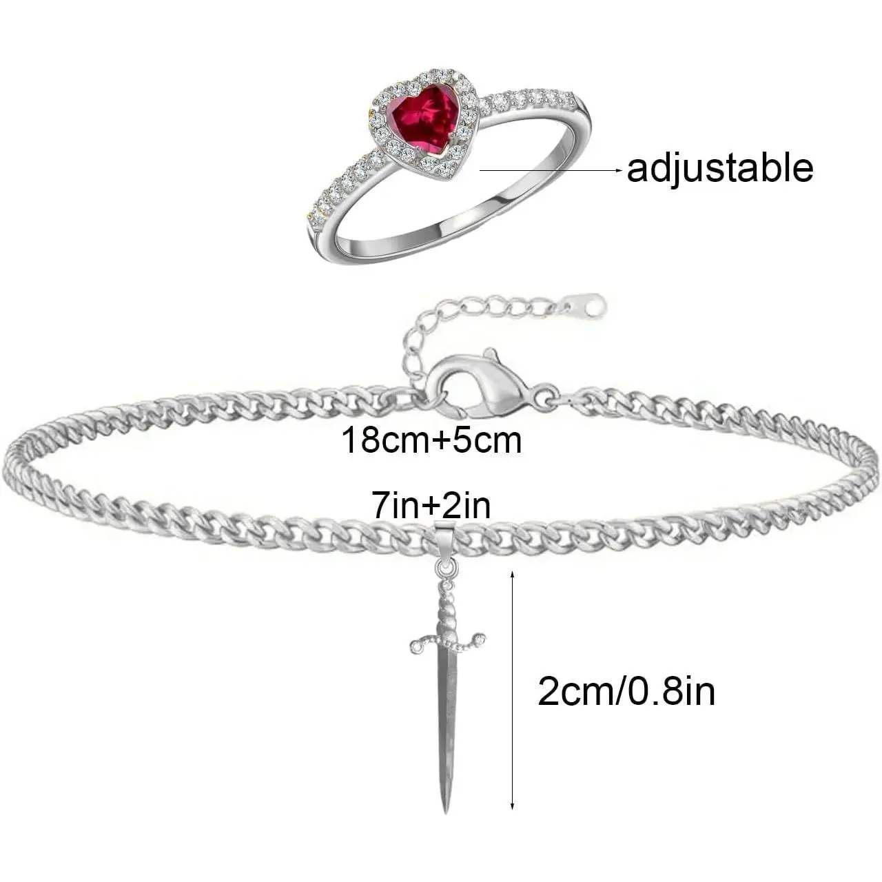 5. Heart Ring Sword Bracelet Set for Couple Gold Silver Heart Ring Sword Link Chain Bracelet Red Gemstone Promise Ring for Her Sword Through Heart Valentine Anniversary Trendy Jewelry