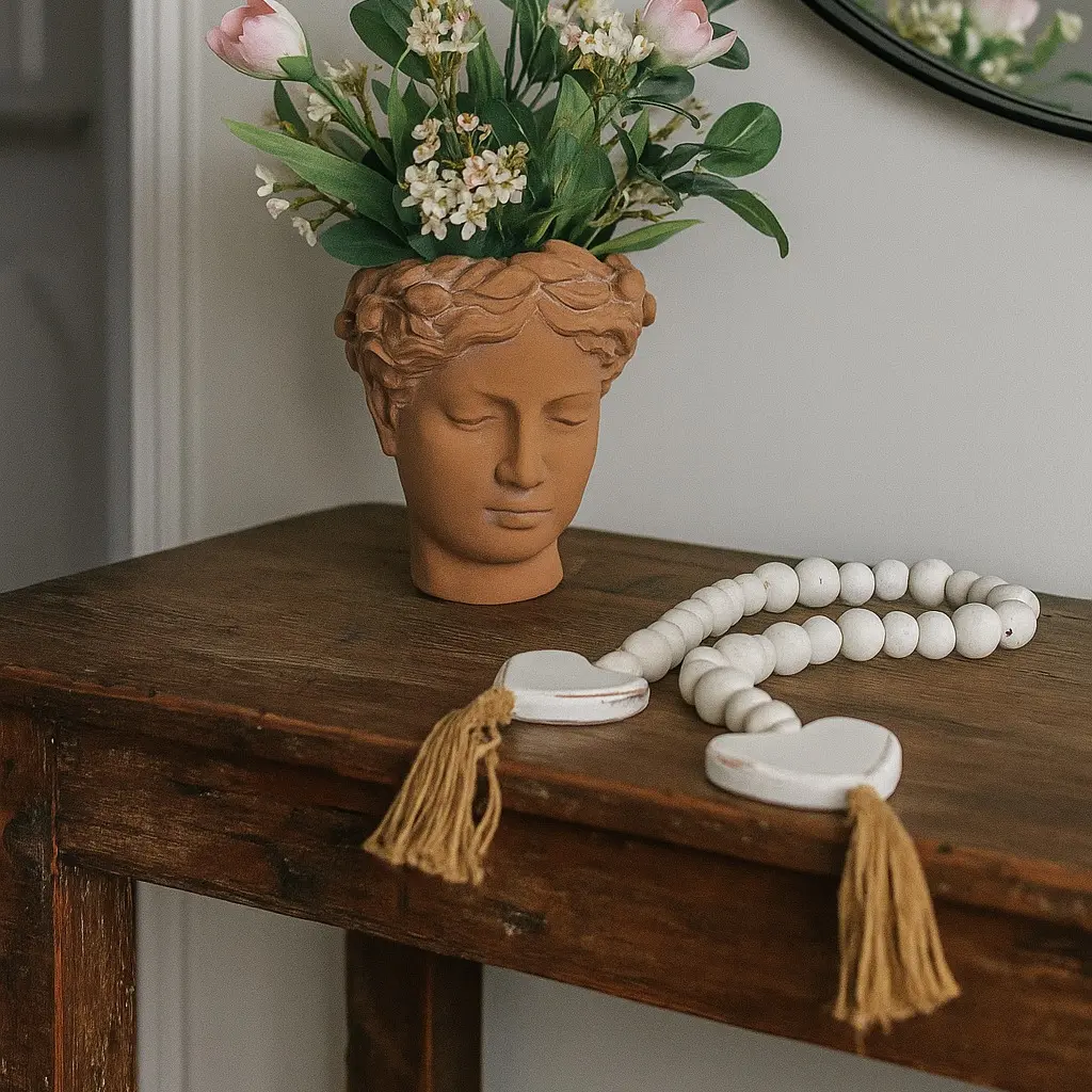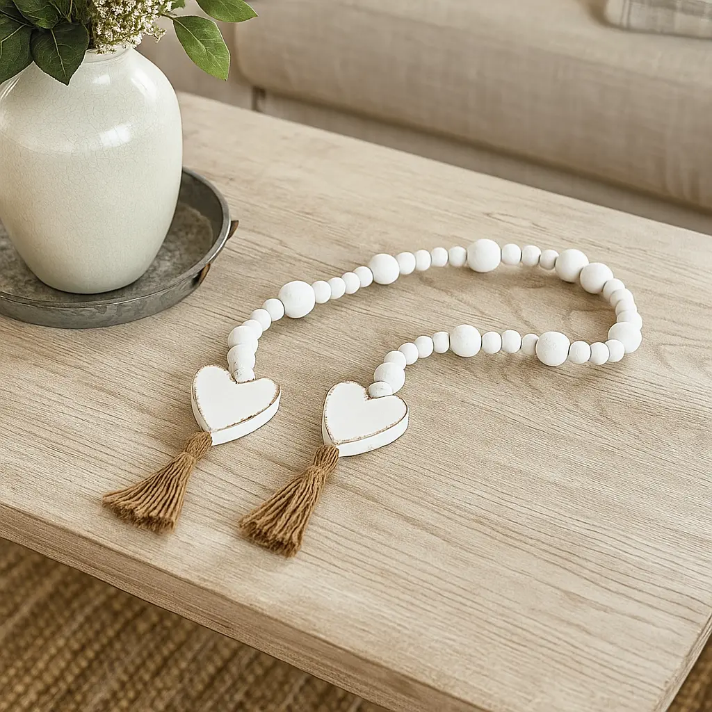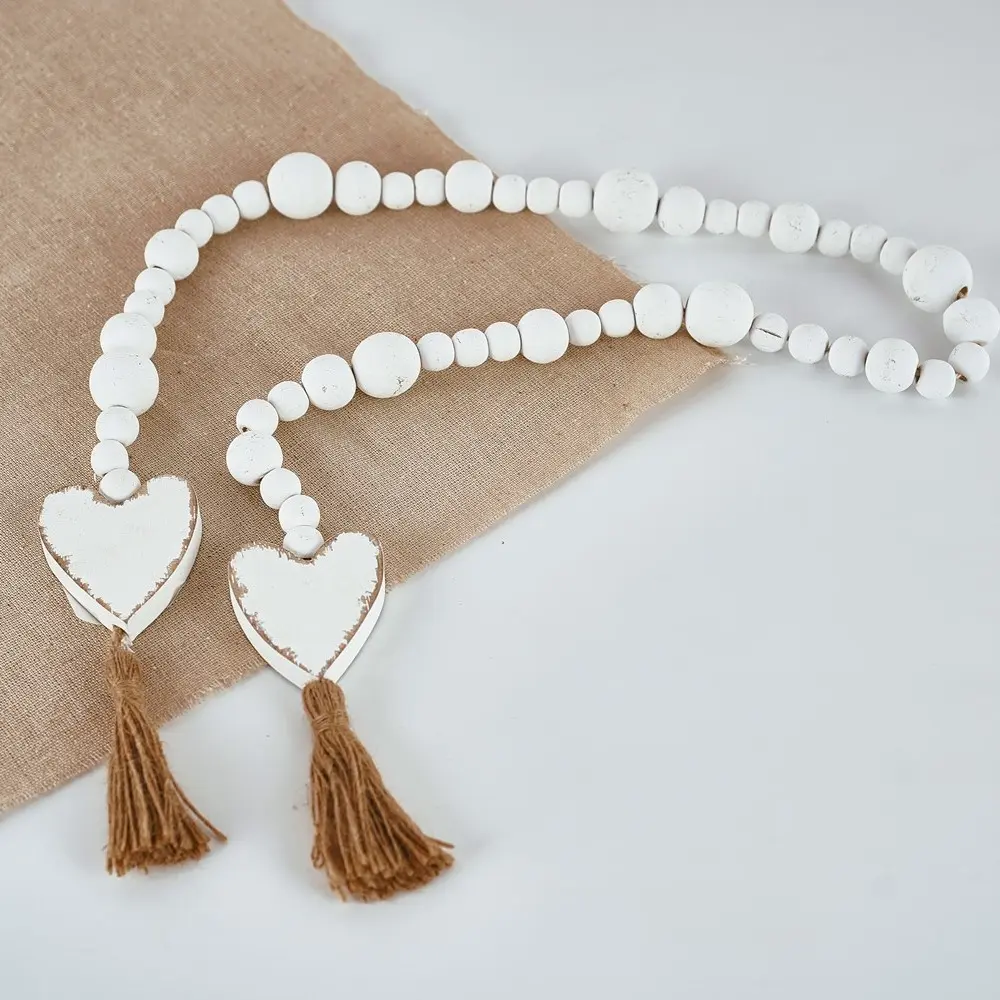 Dress up any display or vignette in a sweet and chic style using our Heart Tassel Blessing Beads. This string of wooden beads features a pale tone with a distressed finish and wooden hearts with jute tassel detailing at each end. Lay this beaded garland on a tiered tray or arrange it in a dough bowl amongst other decorative pieces to add texture and style.