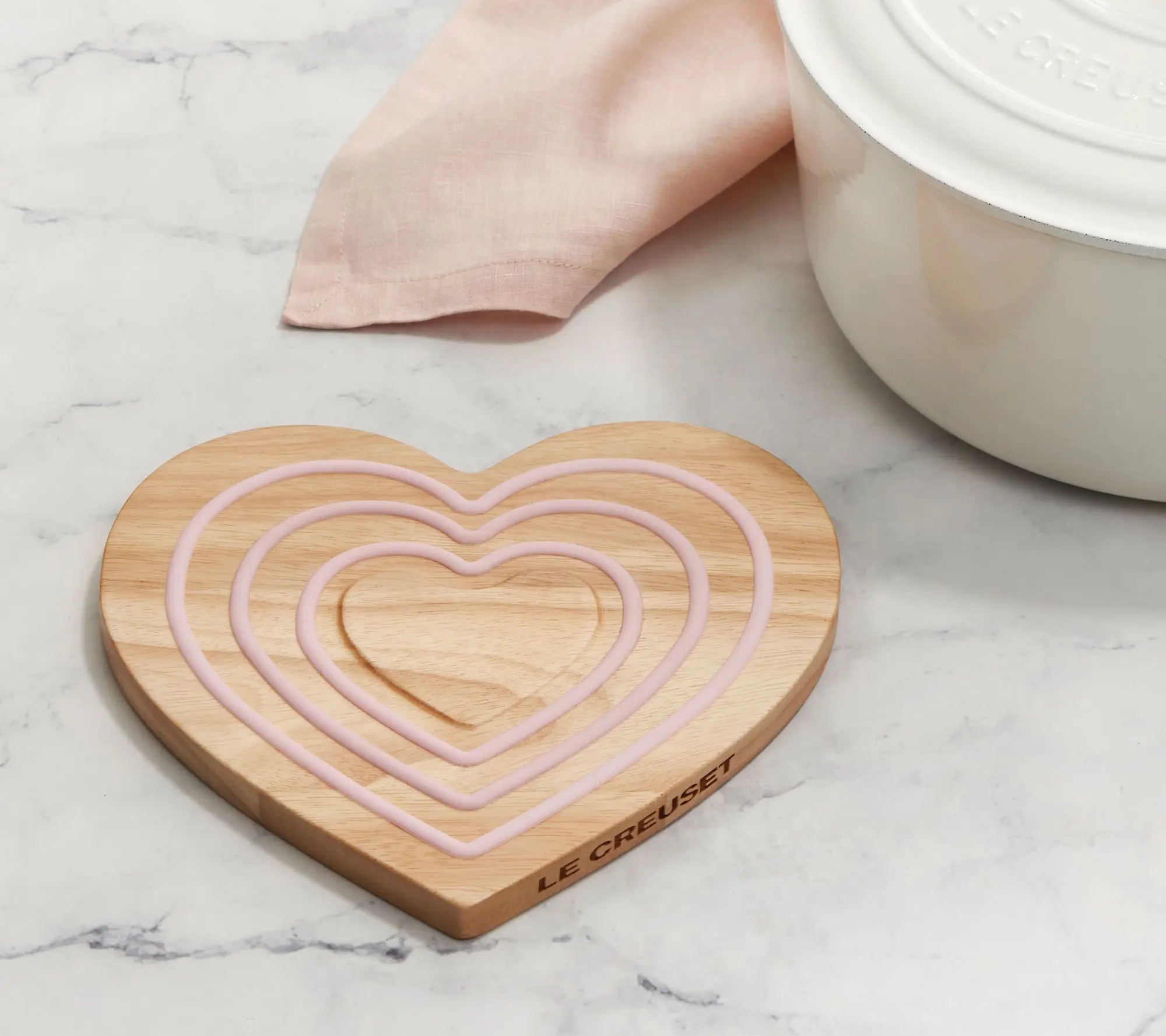 Le Creuset magnetic heart trivet made from acacia wood with heat-resistant silicone rings. Designed to attach to metal cookware for easy, safe countertop protection while cooking and serving. #lecreuset #kitchenfinds #QVCLoyaltyProgram #cookwareaccessories #TiktokShopCreatorPicks