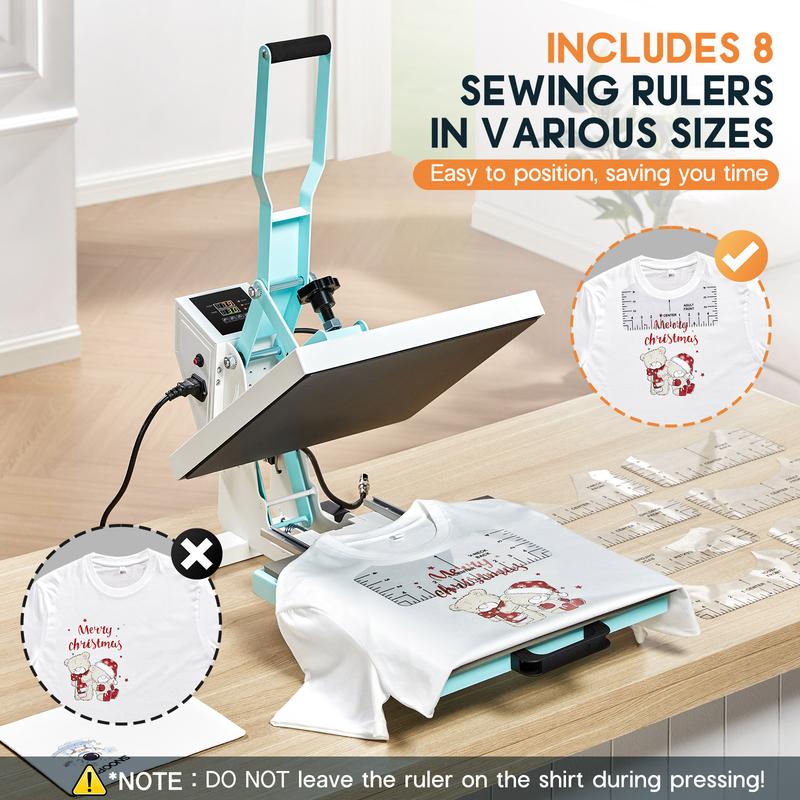 ·Easy Placement & Exact Positioning: Clam shell heat press's pull-out design makes garment placement easier, and the eight sewing rulers provide precise alignment for better heat transfers