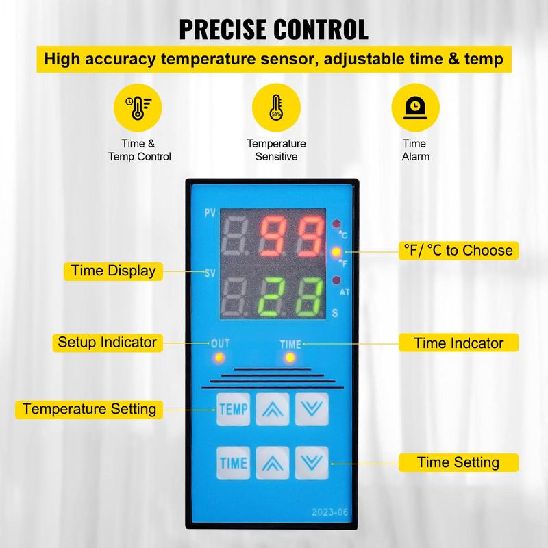 • Digital Timer and Temp Control: A LCD regulator helps users set the temperature and time more flexibly. An alarm will be automatically sounded when the set value is reached. Temperature range: 0- 750℉ / 0 - 399℃ ; Time range: 0 - 999 seconds.