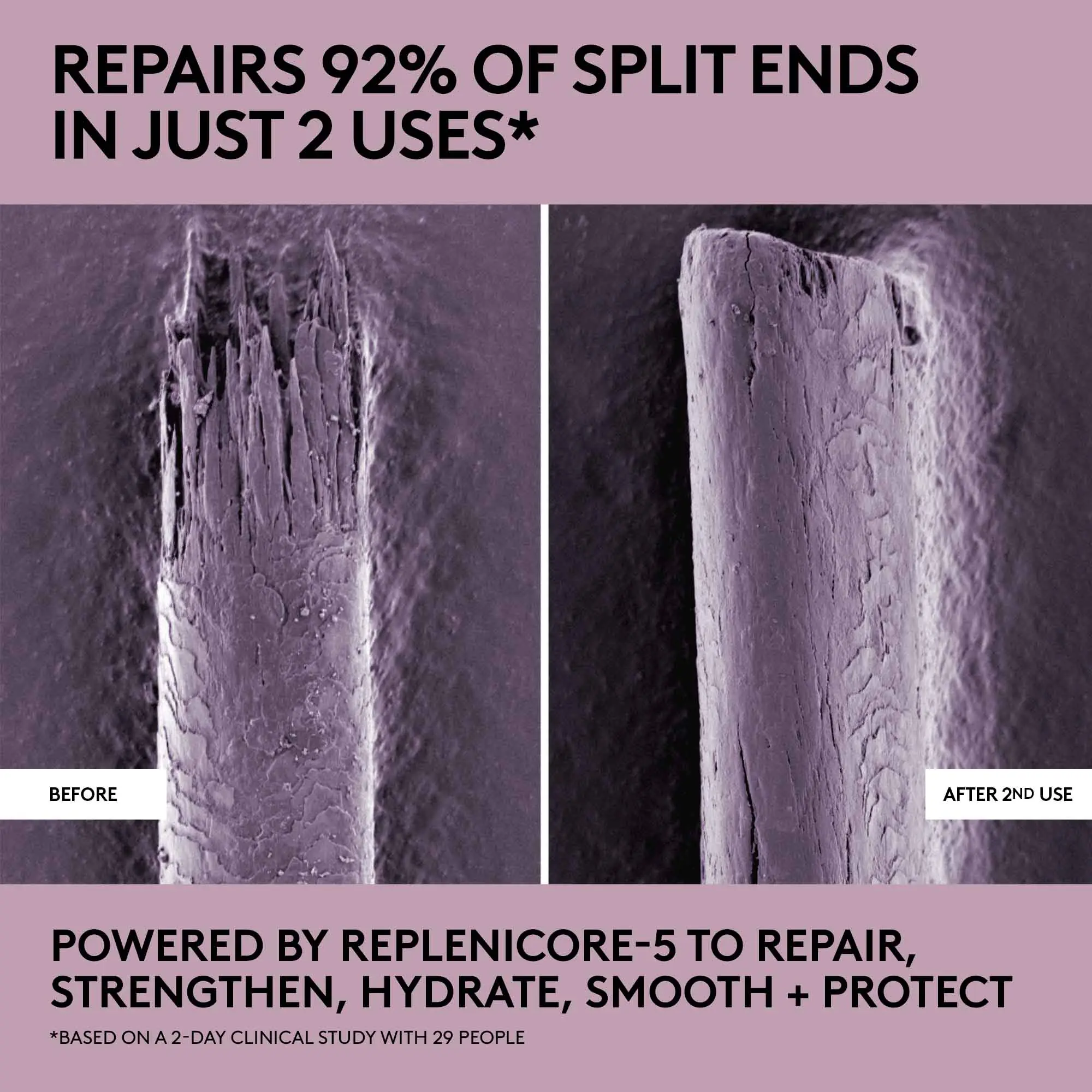 ·Powered by Replenicore-5 to repair split ends + reduce breakage