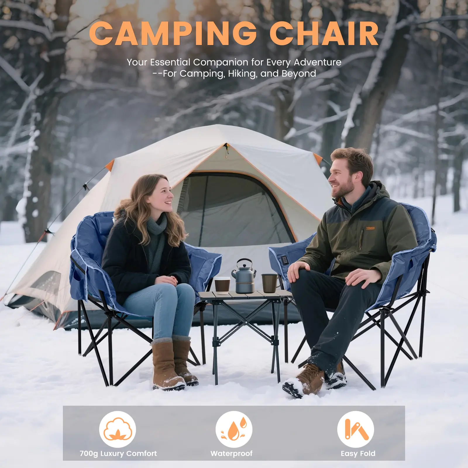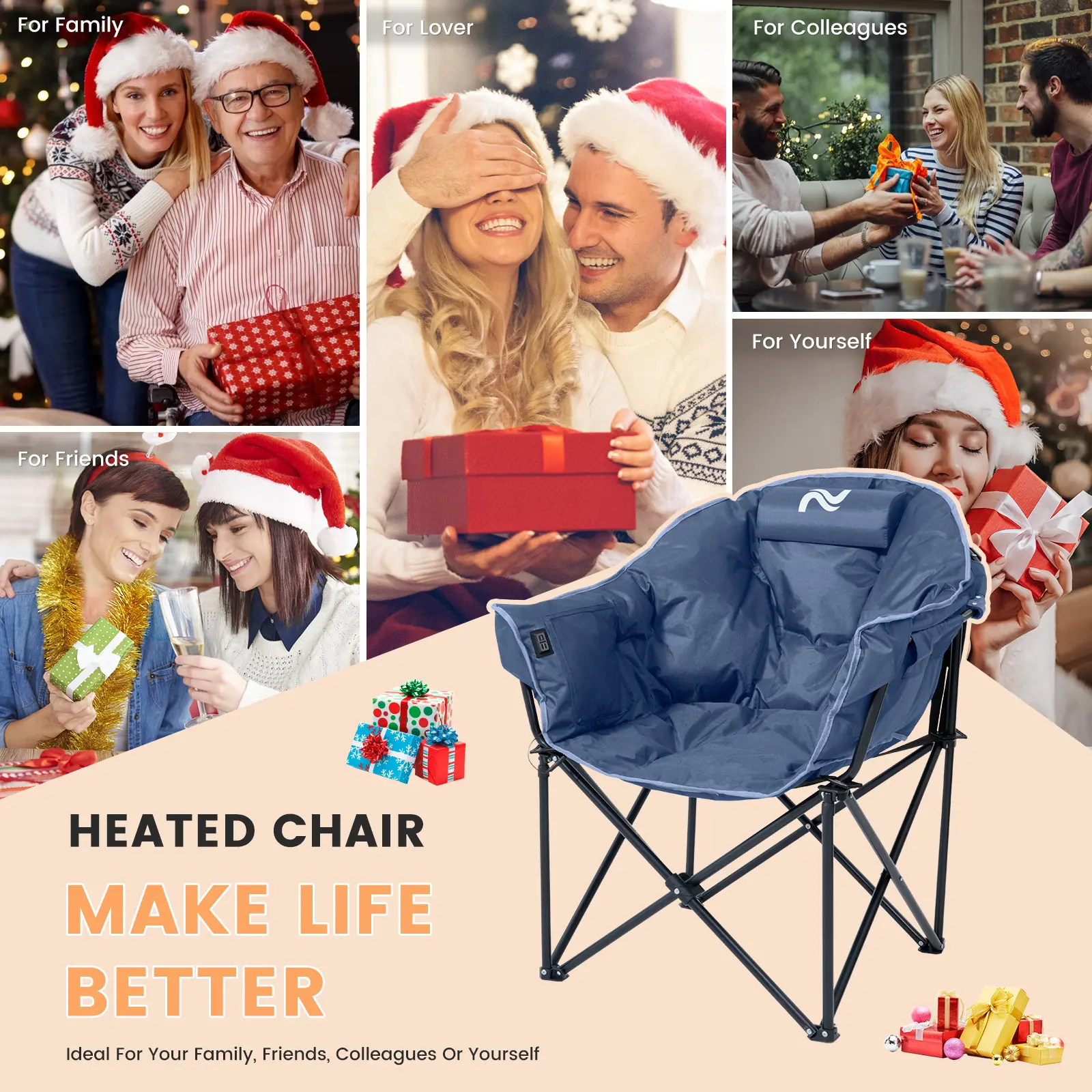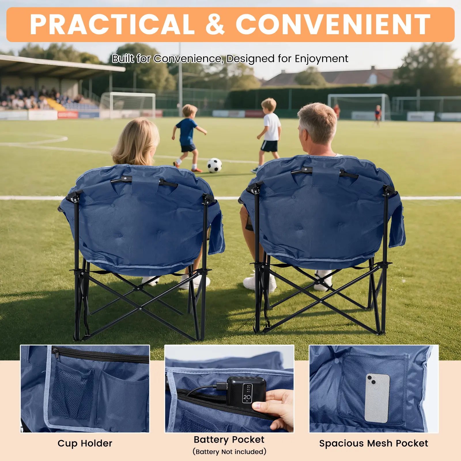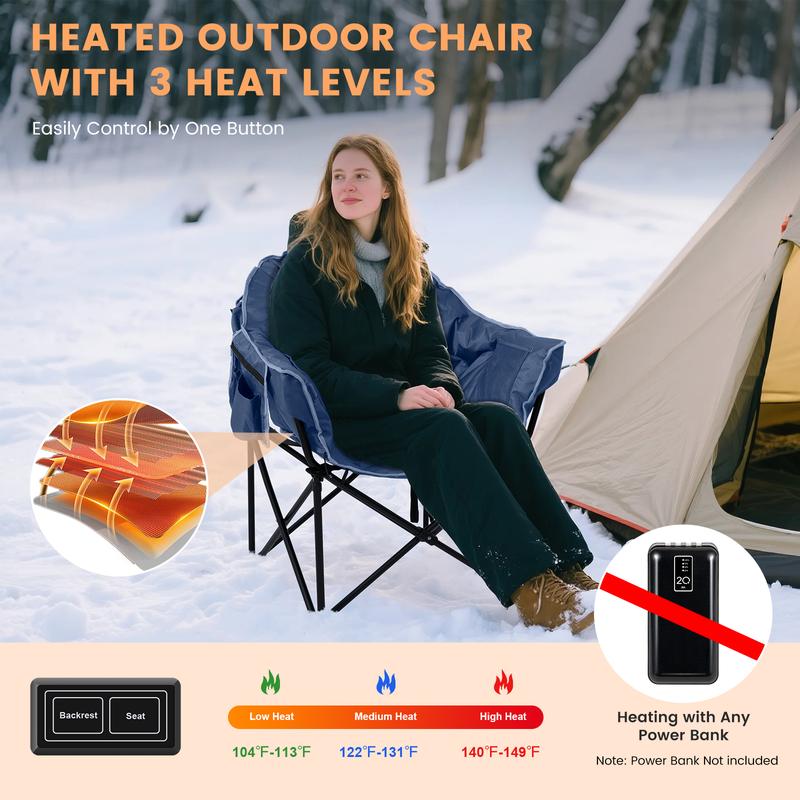 Experience ultimate warmth and comfort with the USB-powered Heated Camping Chair (battery not included). Designed for cold-weather use, it delivers cozy relaxation during outdoor sports, beach outings, picnics, or lawn activities. This heated chair is the perfect companion for any camping adventure. Featuring a spacious seat, ergonomic backrest, and wide armrests—all generously padded with ultra-soft cushioning for superior comfort.