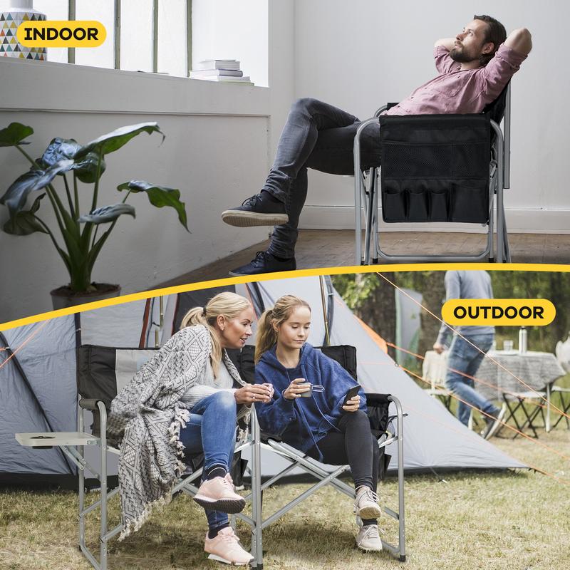 ULTIMATE HEATED DIRECTOR CHAIR: Upgrade your camping experience with our heated director chair, perfect for both warm and chilly days. Dual-zone heating in the back and seat reaches 131°F in just 10 seconds, offering three temperature settings (104°F, 113°F, 122°F)