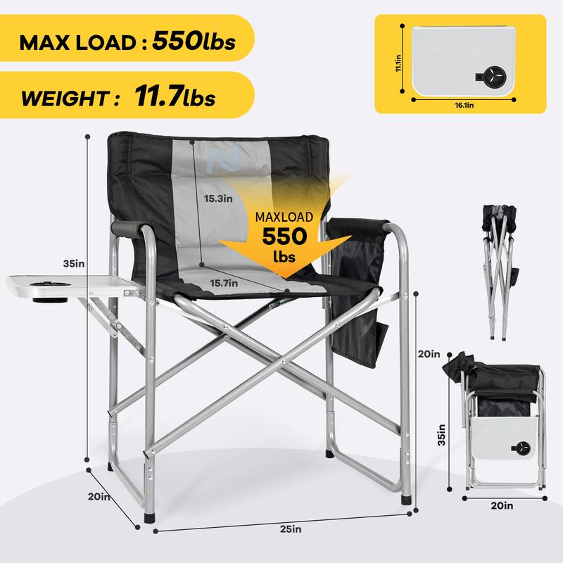 ROBUST & DURABLE FRAME:Crafted with a high-strength aluminum tube frame,our director chair supports up to 550 lbs. Its generous size of 25" L x 20" W x 35" H ensures maximum comfort