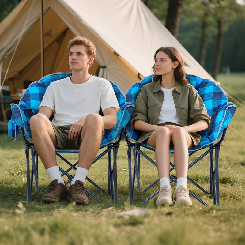 【MOON SAUCER CHAIR】Folding camping chair has moon shape seat, ergonomic design, provide a large area of seat. Completely padded provides extra comfort and support. You can sit cross legged or sideways comfortable to relax in and enjoy your camping. Oversize padded moon leisure portable stable comfortable folding chair for camping, hiking.