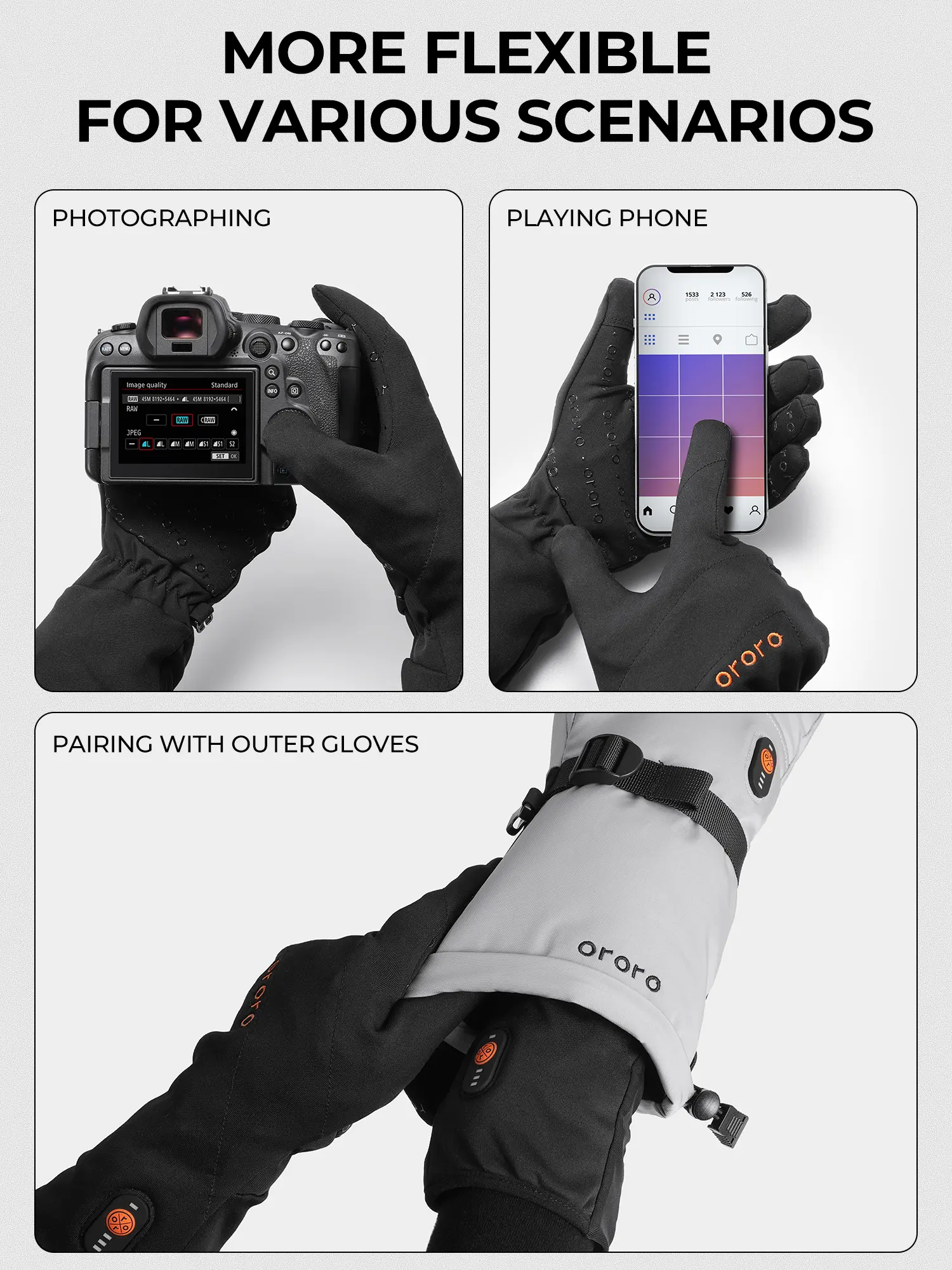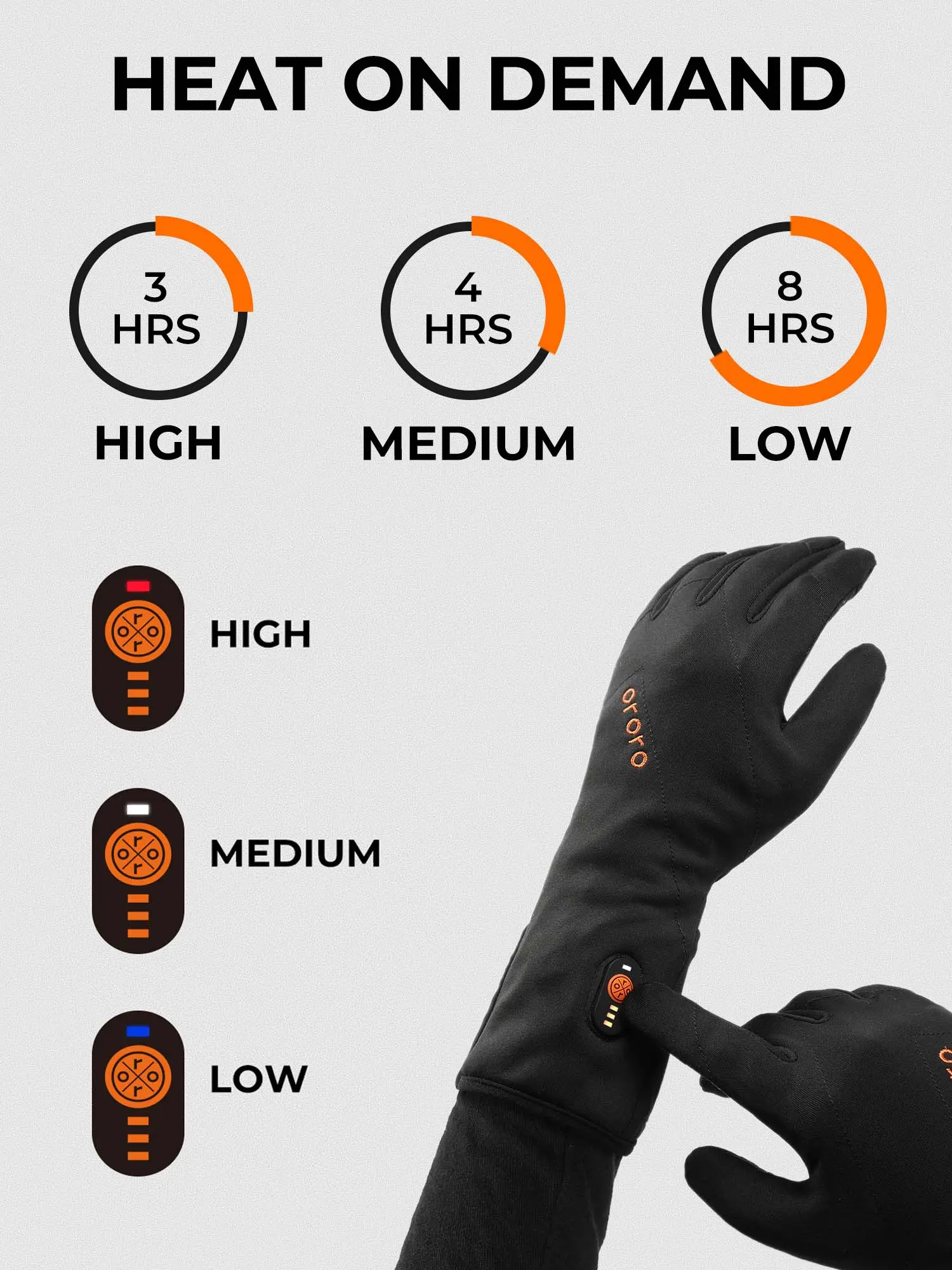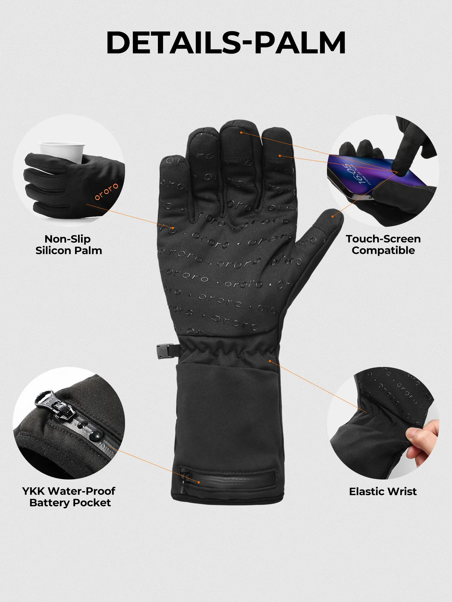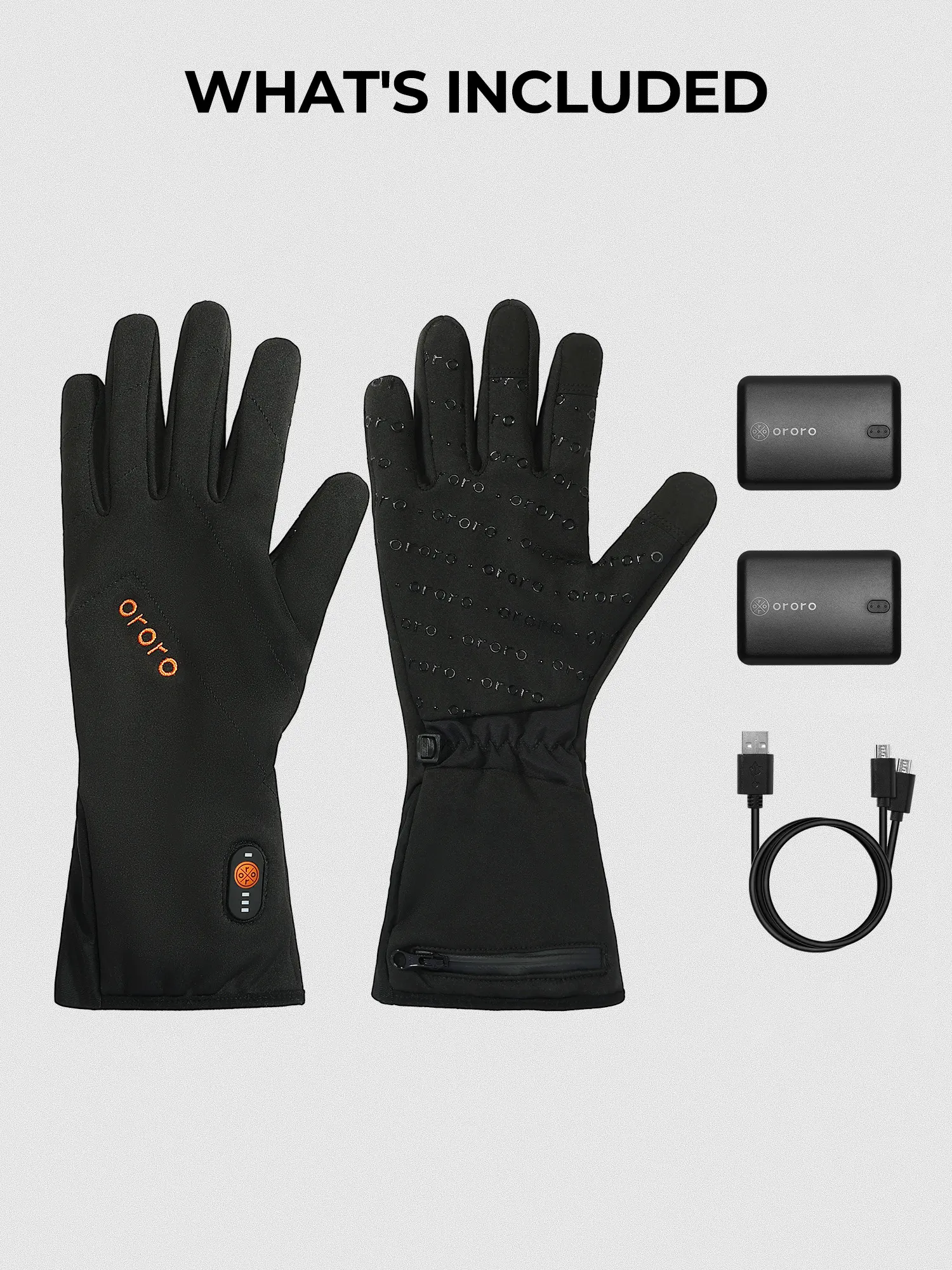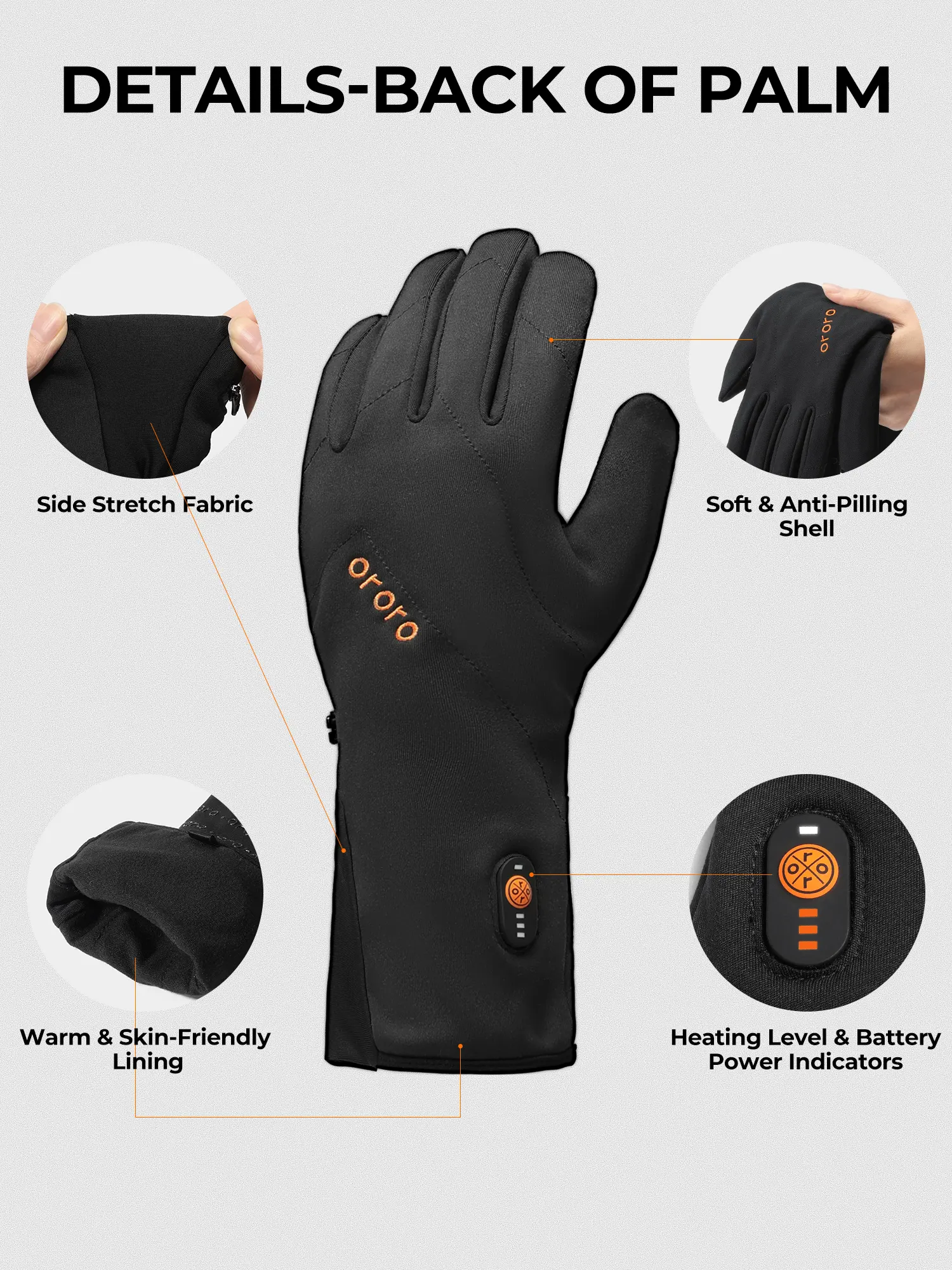 ·Meet the all-new ororo Heated Liner Gloves with Battery that provide sufficient dexterity and brushed-tricot-polyester-lined softness while the cushiony-feeling of warmth is guaranteed. The microfiber shell enhances durability and blocks light rain and snow with the water-resistant coating.