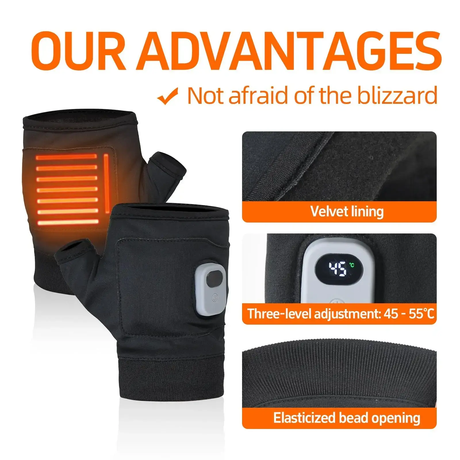 [Adjustable Temperature]: Features three temperature settings at 45, 50, and 55 degrees for customized warmth. [Fingerless Design]: The fingerless style allows for easy use of touchscreens and everyday tasks without removing gloves. [Digital Display]: Equipped with a digital temperature display for easy monitoring and manual adjustment of warmth levels. [Quick Charging]: Supports type-C rapid charging, allowing for efficient power replenishment of the heating function.