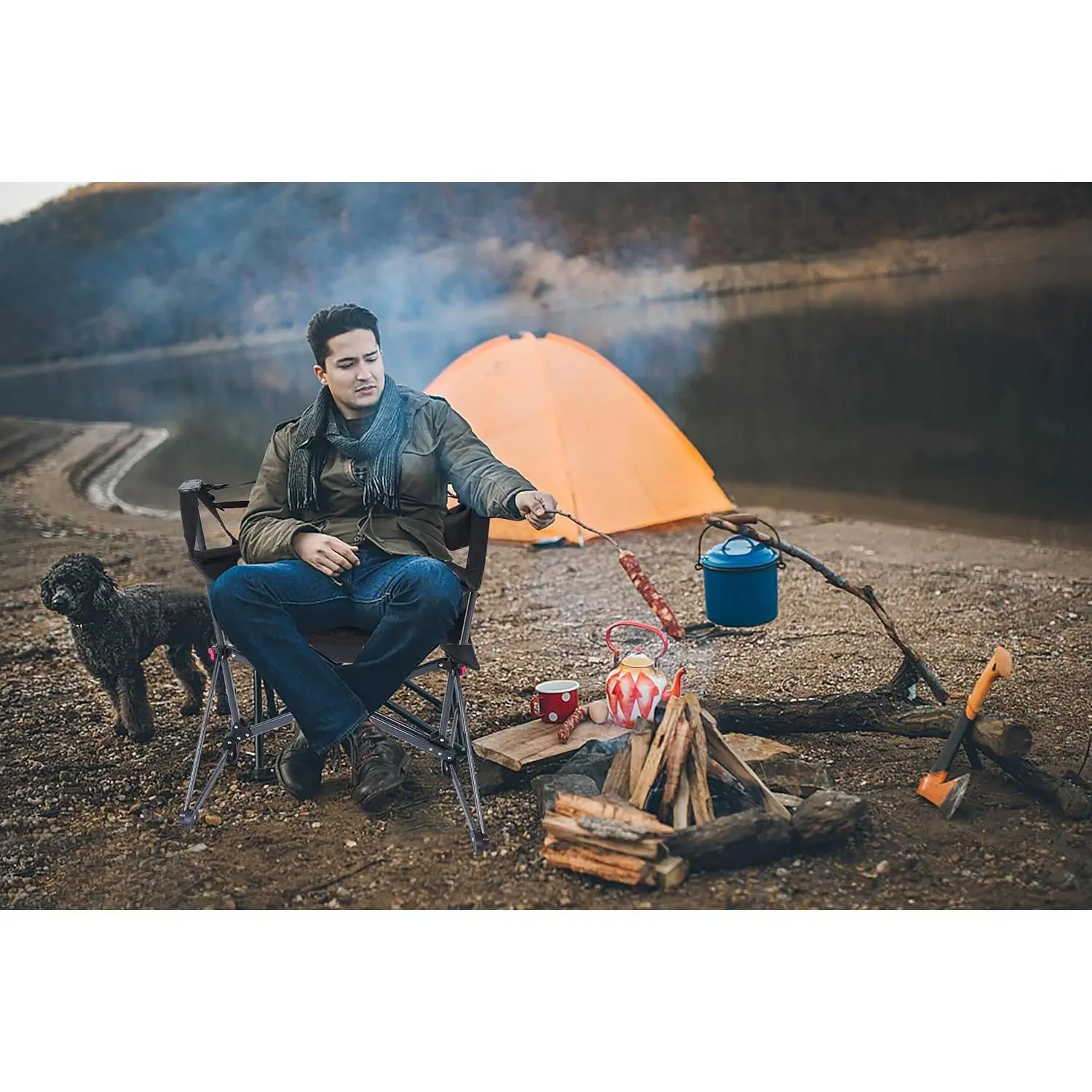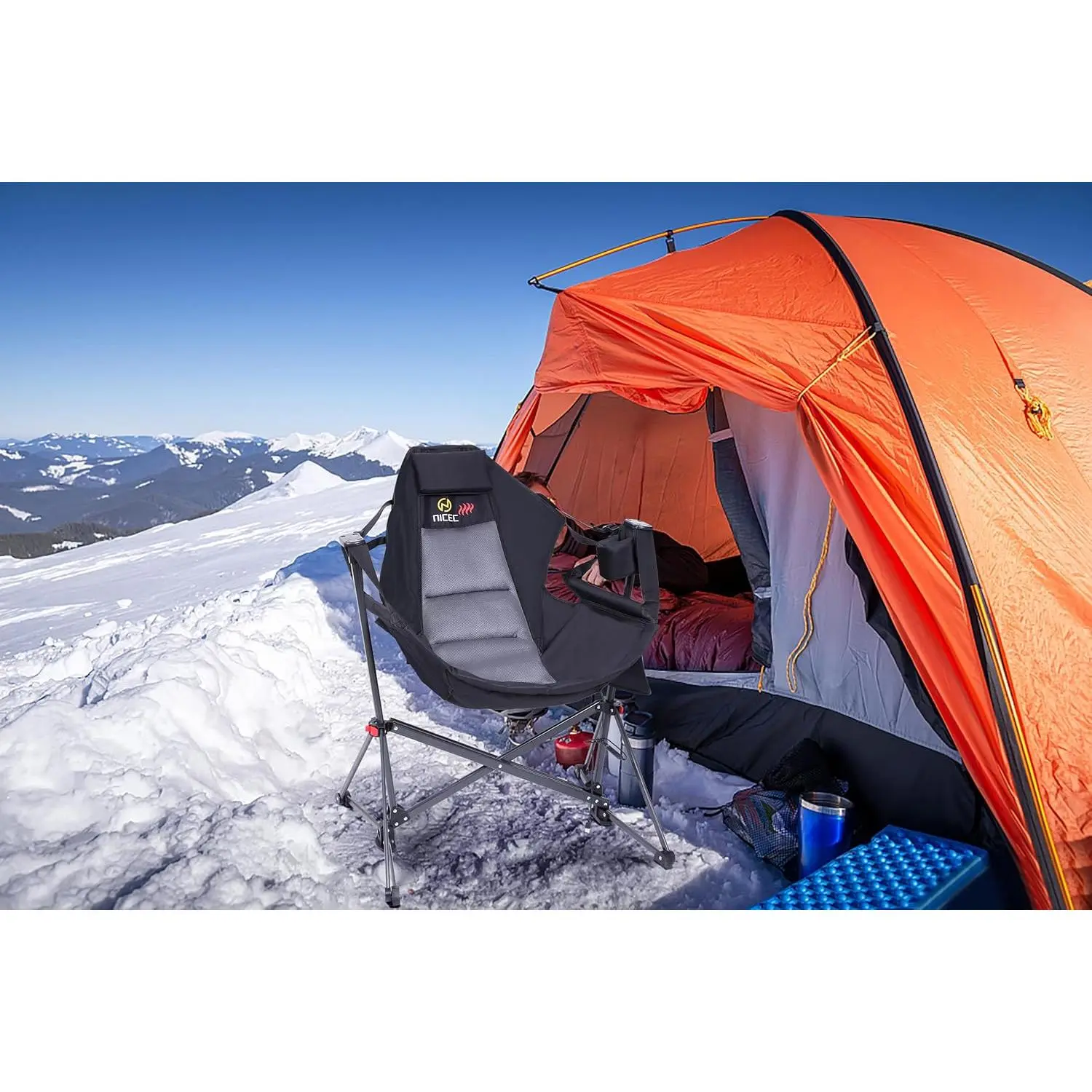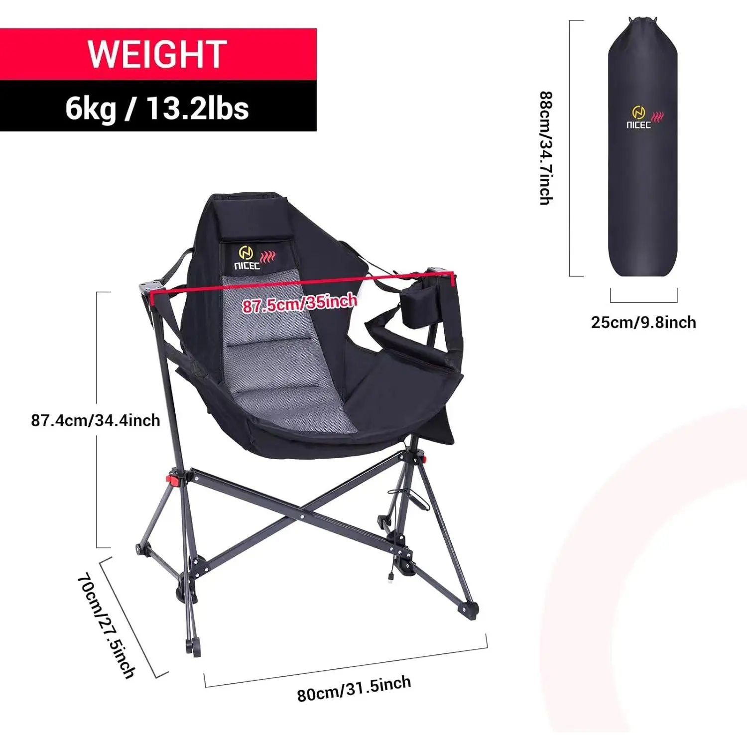 This portable swing chair is perfect for camping. It folds down to 35.7" x 9.8" and weighs 13.2 lbs. The X-shaped frame ensures durability. Secure the red buttons after unfolding. The chair can support up to 300 lbs. It includes a cup holder and side pocket. No hooks or trees needed; set up anywhere.