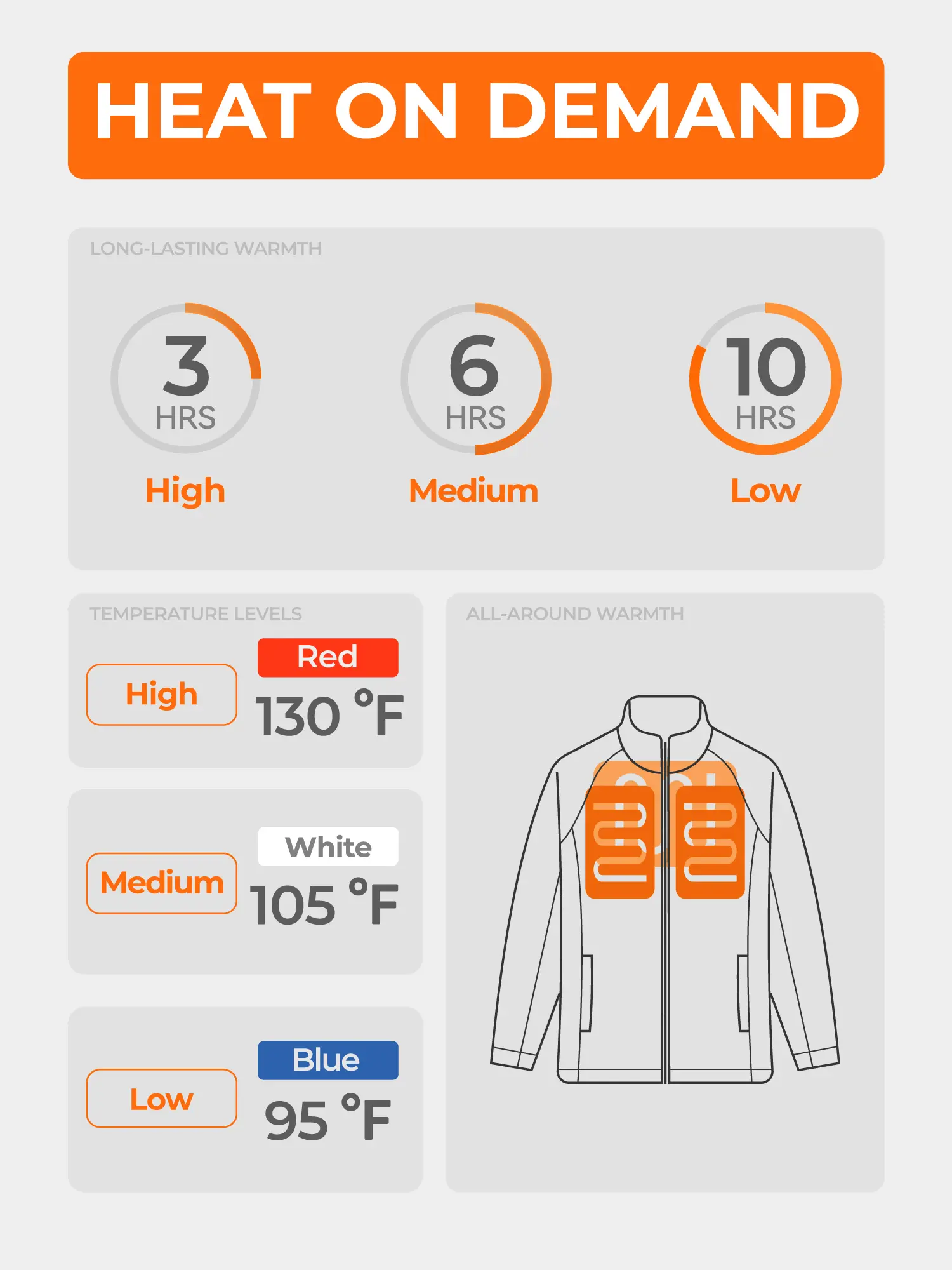 3 carbon fiber heating elements (left & right chest, middle-back)