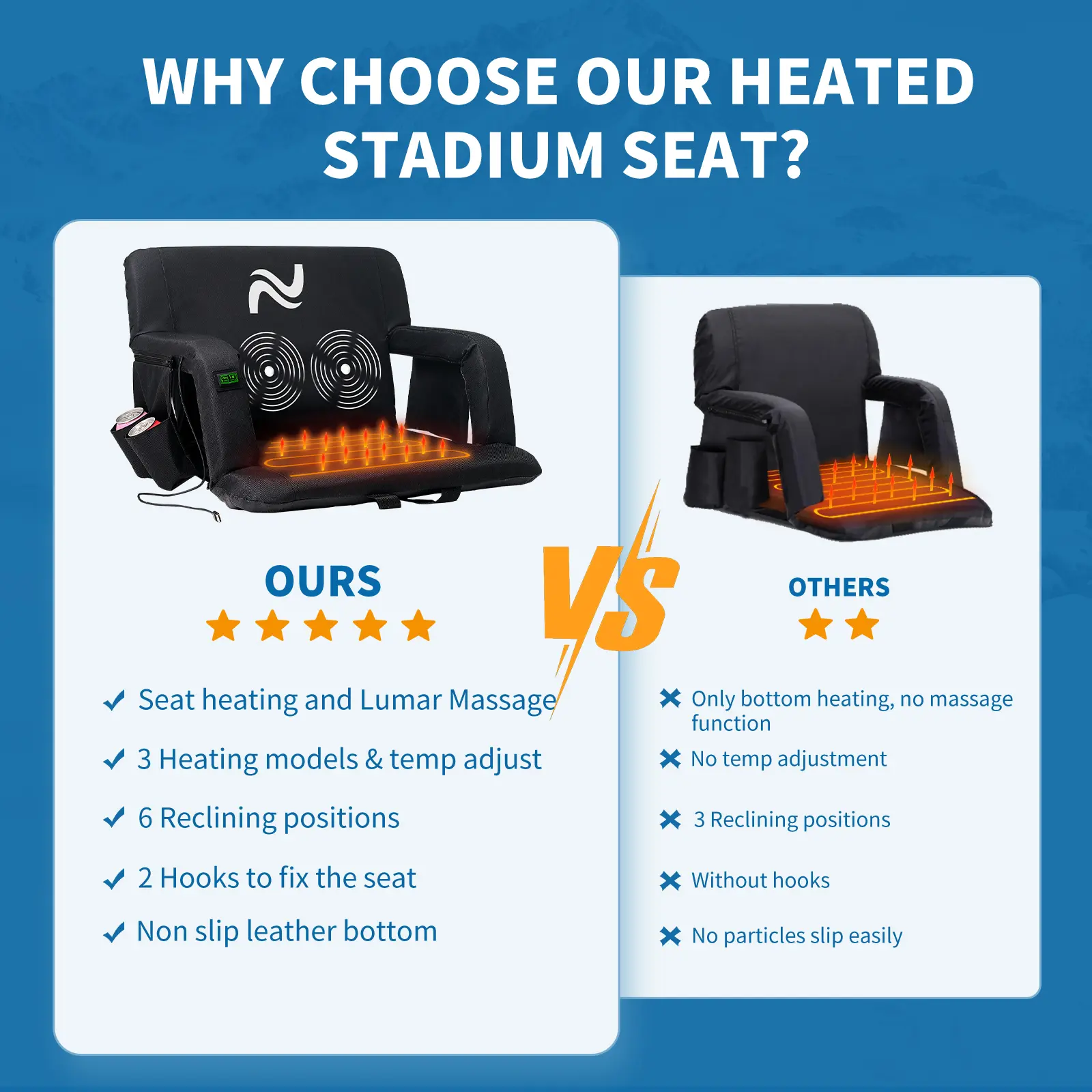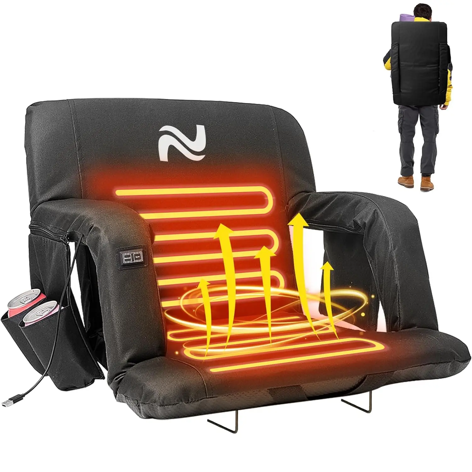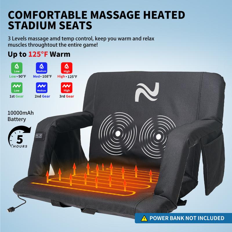 • 3 Levels of Heating: Our heated stadium seats offer three adjustable heat levels (high, medium, low) for personalized comfort. USB power ensures cozy warmth, even in cold weather. The upgraded control switch allows for easy, one-touch temperature adjustment.