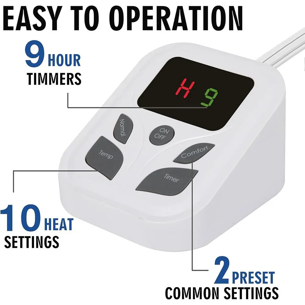 I absolutely love this so much that I bought another one just so ild have one on the bed even on laundry day lol! Great product! Heats up fast with different temp settings. It has a built in adjustable timer. Will put you straight into the comfort zone!