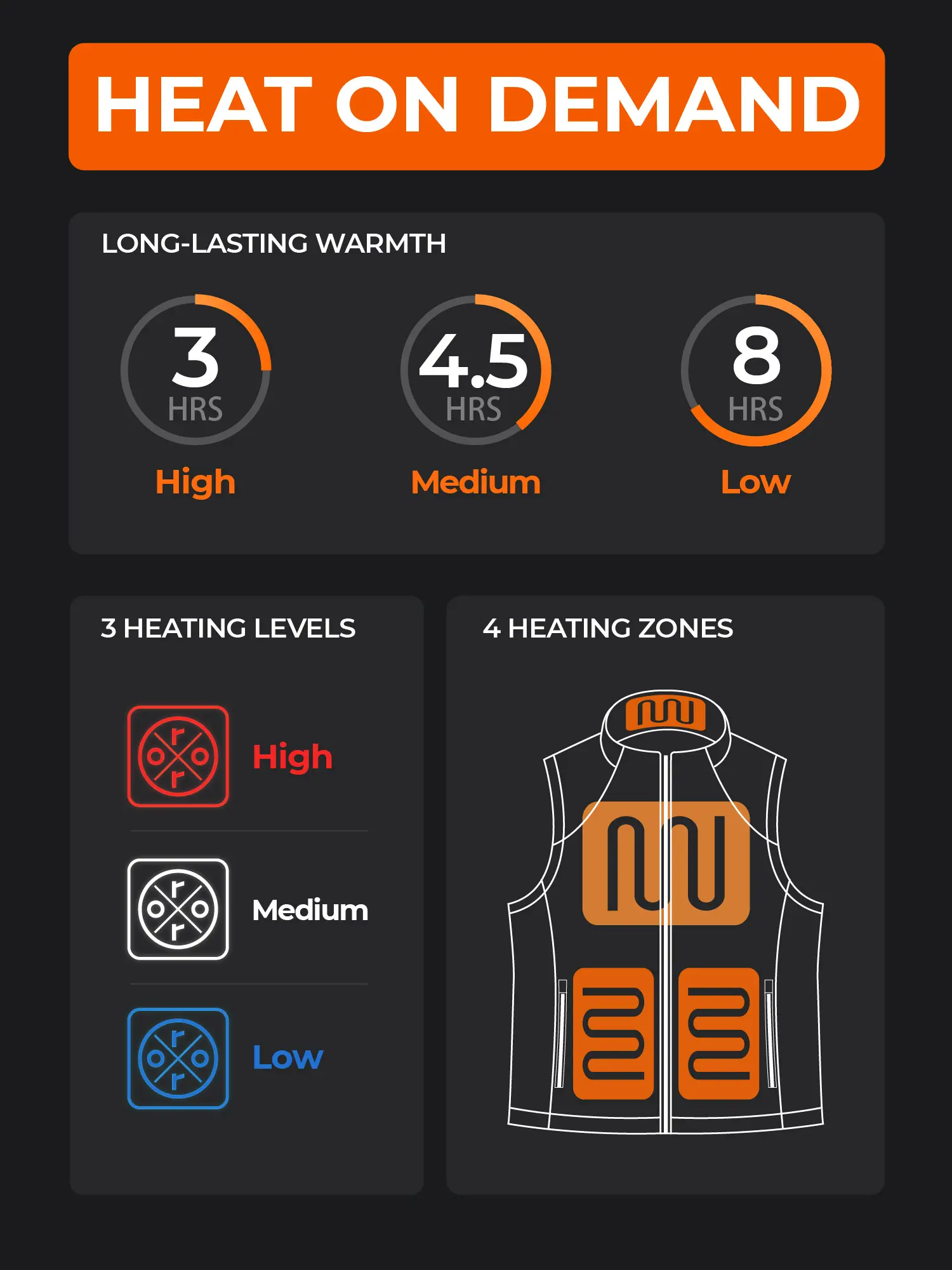 ·Upgraded Neck Heating: Now with an additional heating zone at the collar, this 4-zone heated fleece vest delivers targeted warmth to your neck, pockets, and expanded back area. Easily adjust between 3 heat settings (High/Medium/Low) with a simple press of a button.