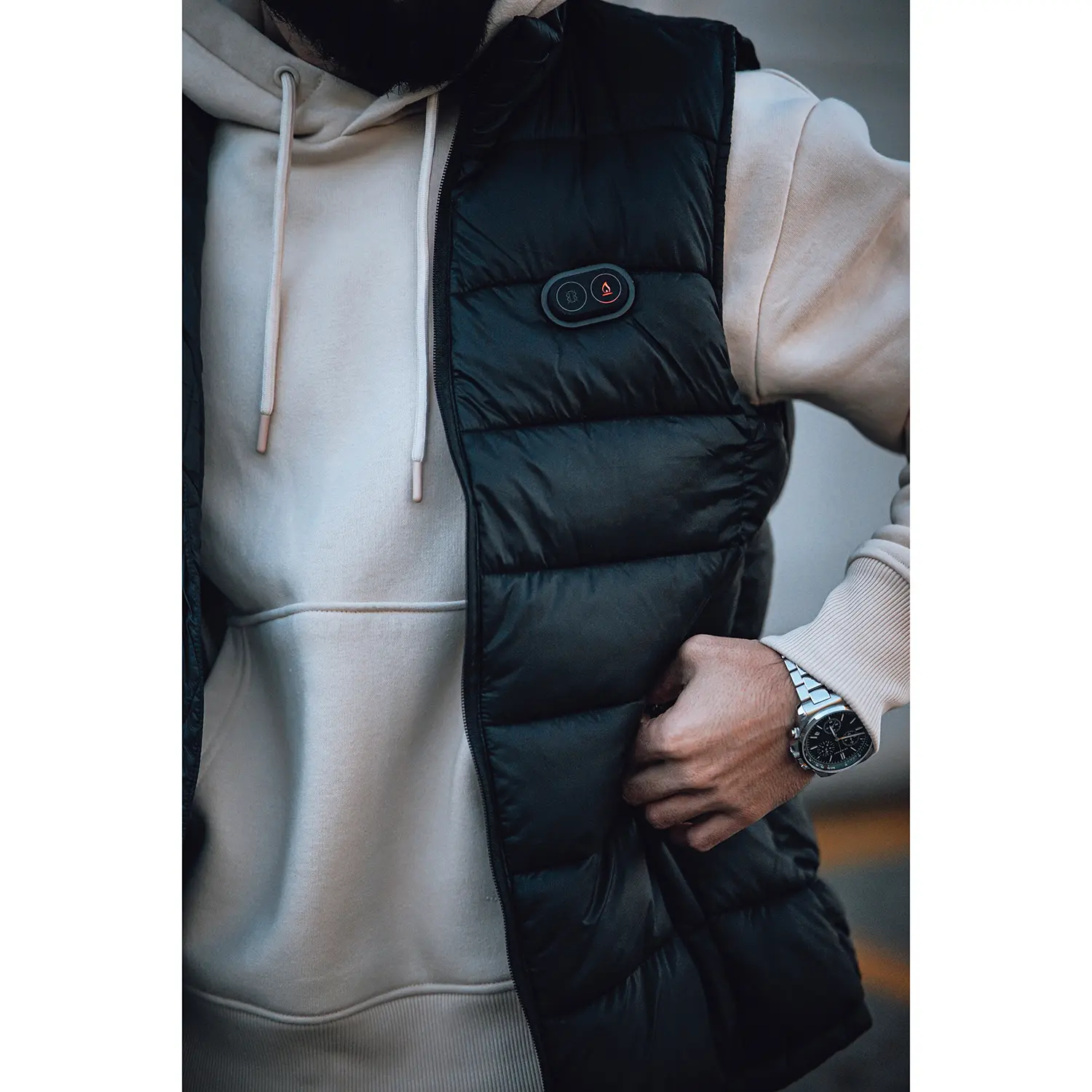·5 carbon fiber heating elements generating heat across collar, back, back waist, as well as underneath two pockets for core-body warmth. Two switches, the front and rear heating zones are separately controlled.