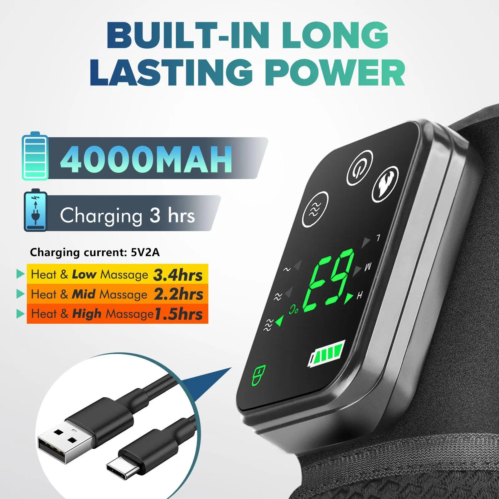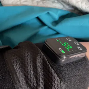 Comes with extra straps for length if needed. Does heat and vibration to help with pain in your knee. Fits well enough you can walk around with it on if needed. Screen indicates when fully charged which is nice. Three heat settings and three vibration settings for maximum comfort
