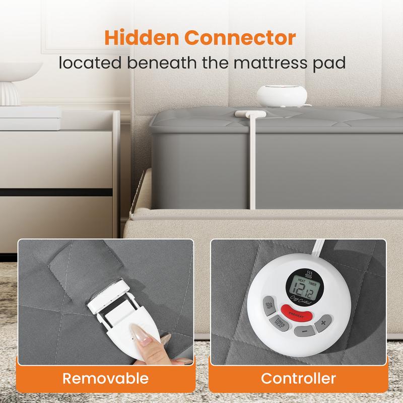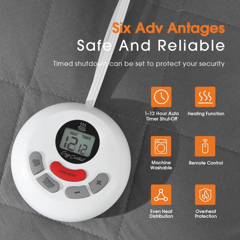 ·Choose from 10 heat settings with 1–12 hour auto shut-off and overheat protection for safe, customized comfort. The 6 ft power cord and 12.8 ft controller cord make it easy to adjust settings from bed.