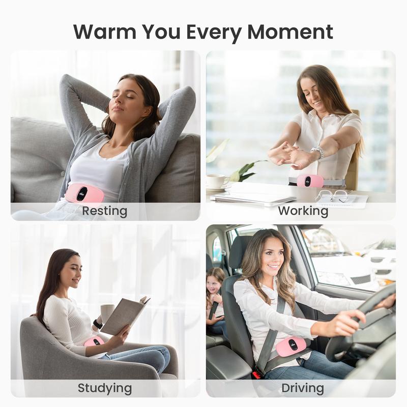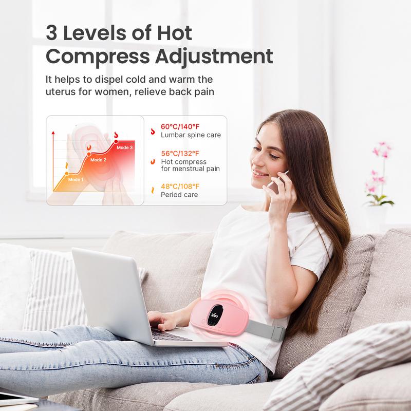 This portable cordless belly & back comfort pad offers fast heating within 2 seconds. It features three heating levels: 108°F/48°C, 132°F/56°C, and 140°F/60°C. Perfect for daily use, it's an ideal gift for Mother's Day. The built-in 2000 mAh rechargeable battery provides up to 4 hours of run time. Charge via type C USB.