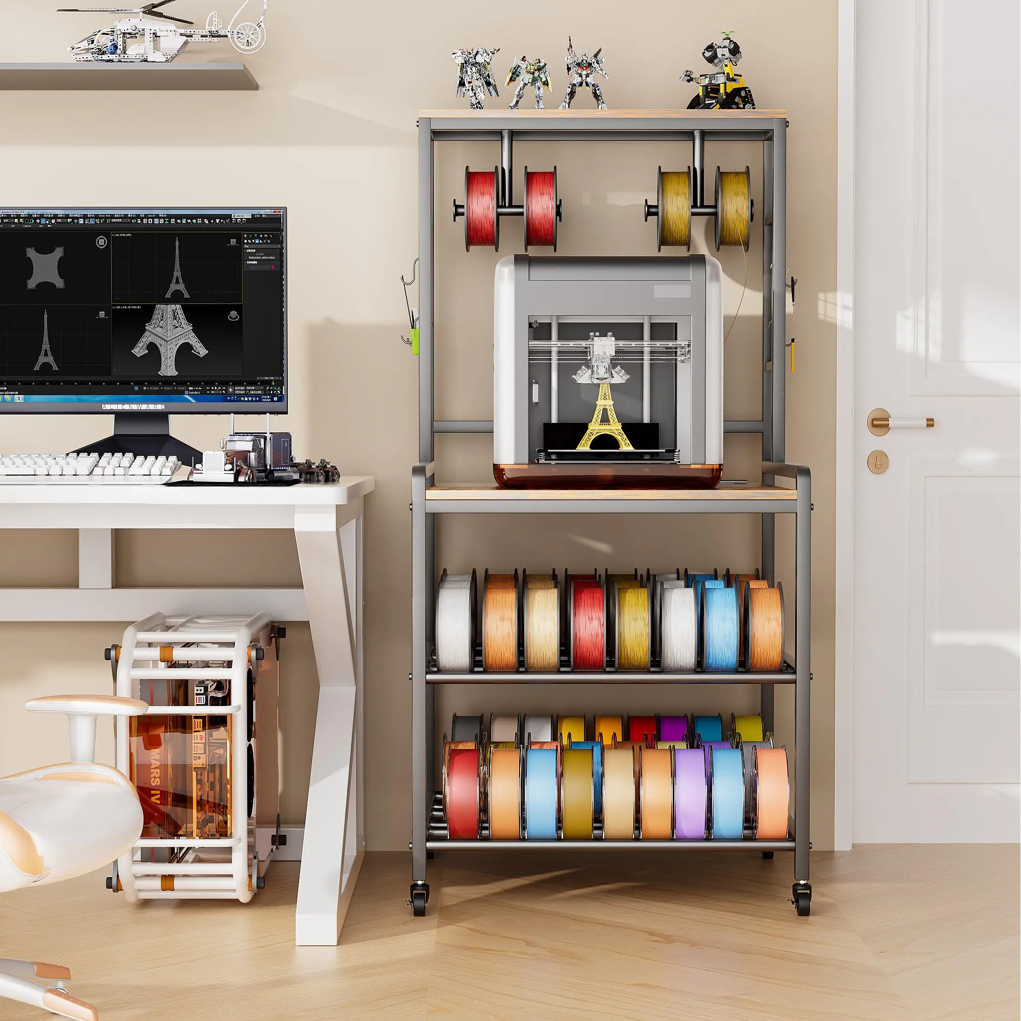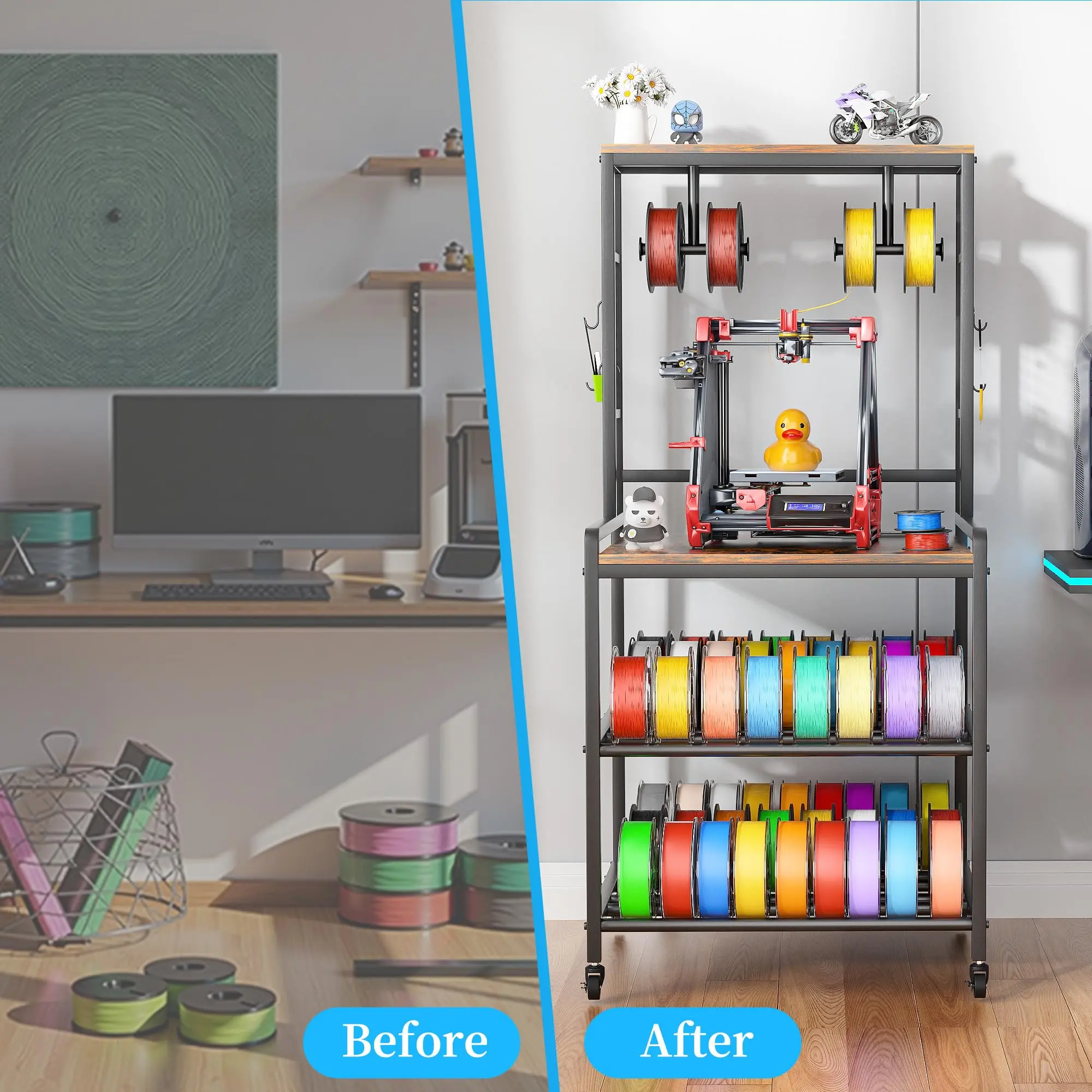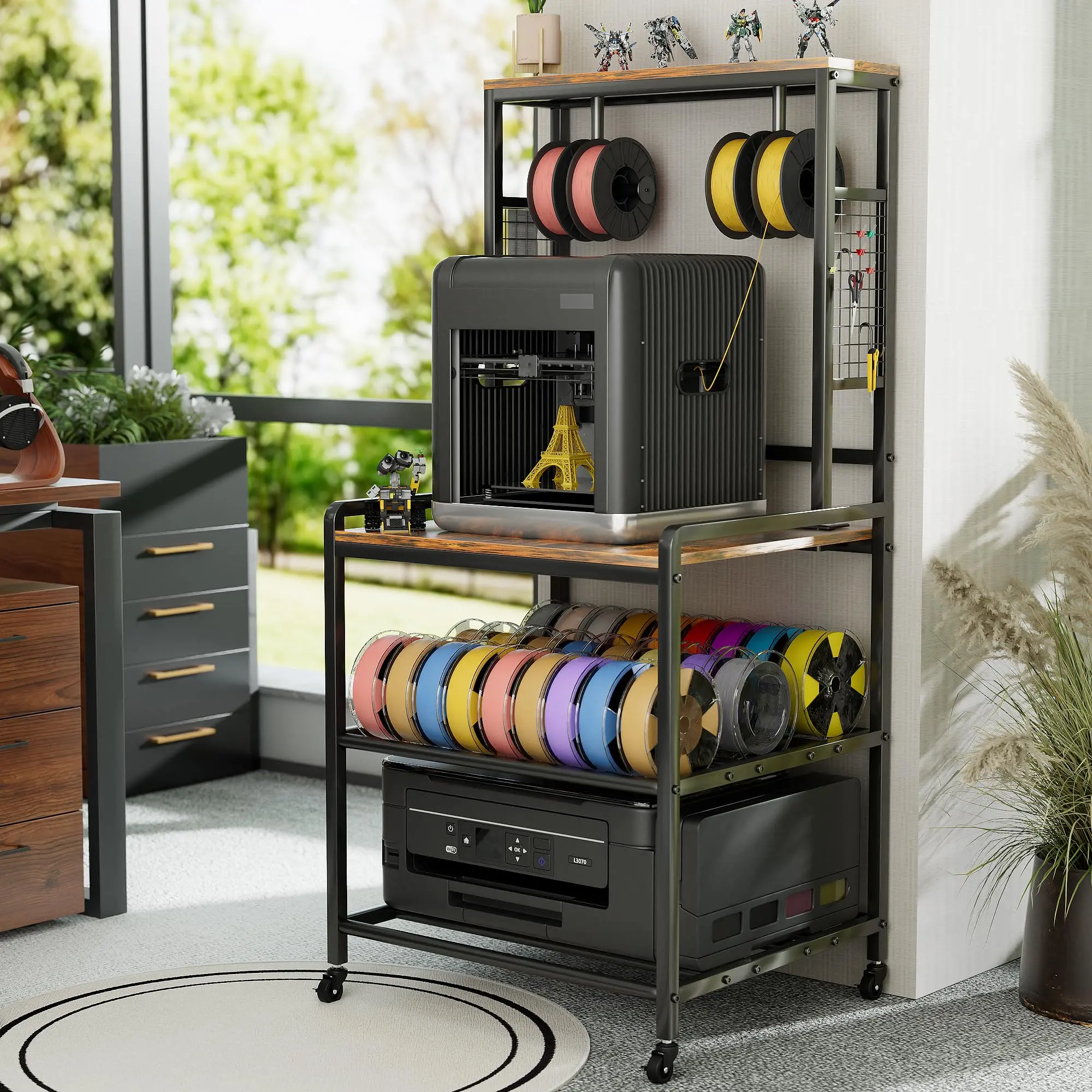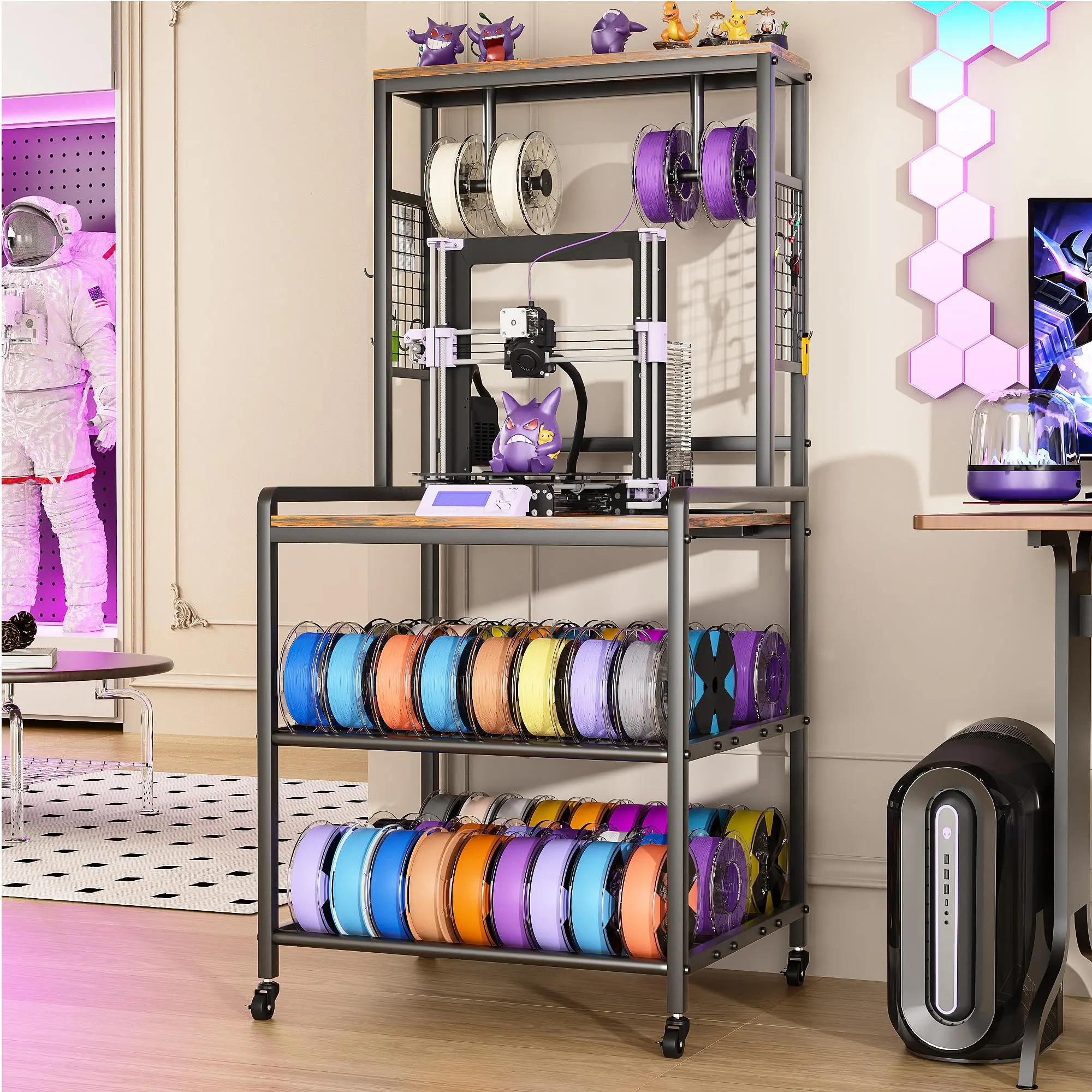 【Powerful Filament Storage Space】This large printer stand, in addition to its wide desktop and side hooks, has a filament Holder on the top that can store 4 spools simultaneously for work! The bottom two layers are specifically designed for storing various Spool, including PLA/ABS/PETG, and can store over 60 spool shafts.