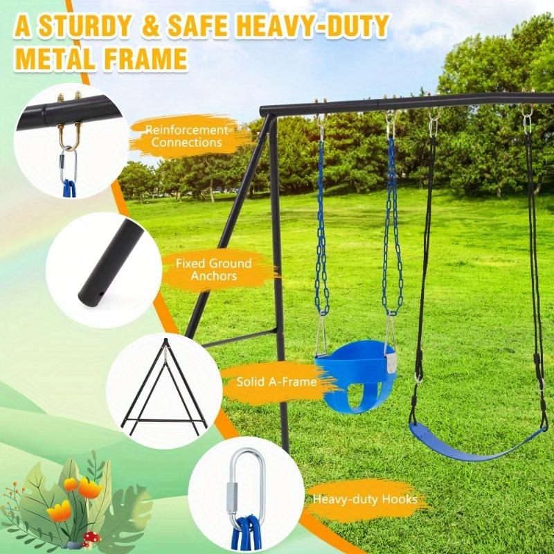 The swing set is made of high-quality Q195 steel with a powder-coated finish, ensuring durability and resistance to rust. This swing set outdoor for kids features a heavy-duty A-frame metal stand that can support up to 440lbs.