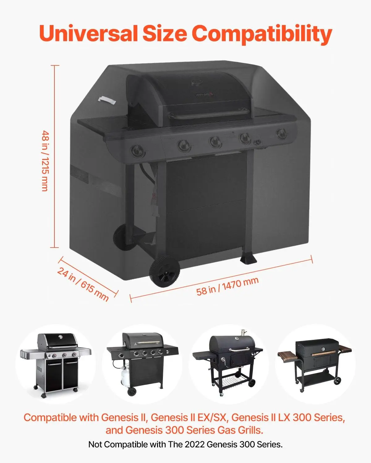 ·Wide Compatibility Sizes: The bbq gas grill cove dimension is 58x24x48 inch / 1470x615x1215 mm. The universal grill cover fits most grills. Simply measure your grill to find the perfect-fitting cover. NOTE: This product does not include a grill