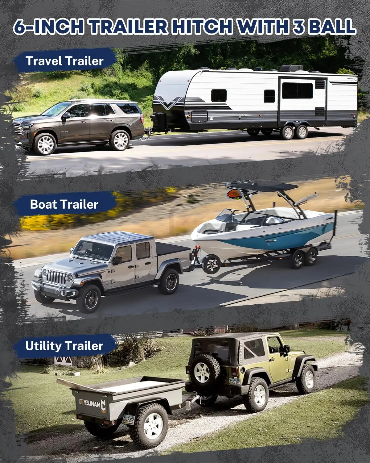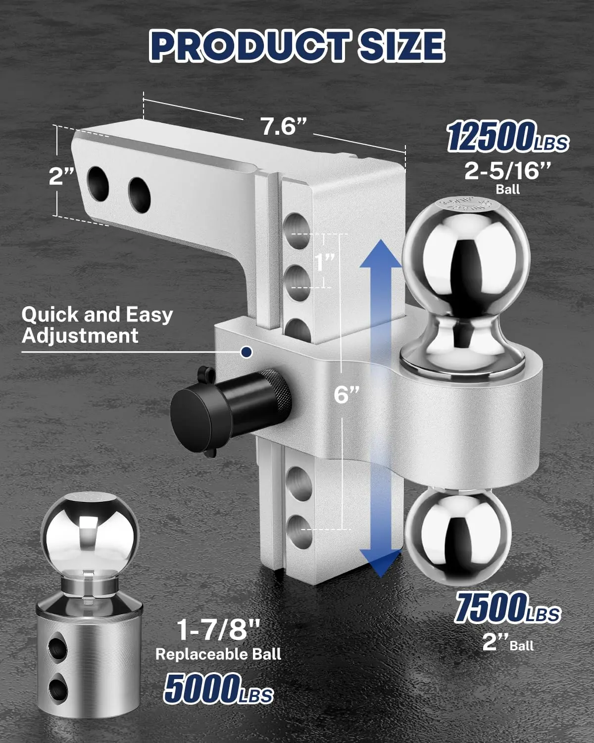 ·Multiple Balls: Three balls (1-7/8", 2", 2-5/16") offer flexibility in towing configurations.