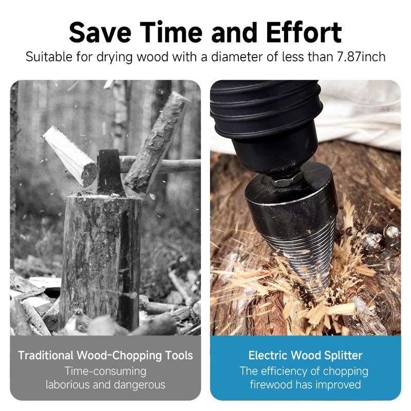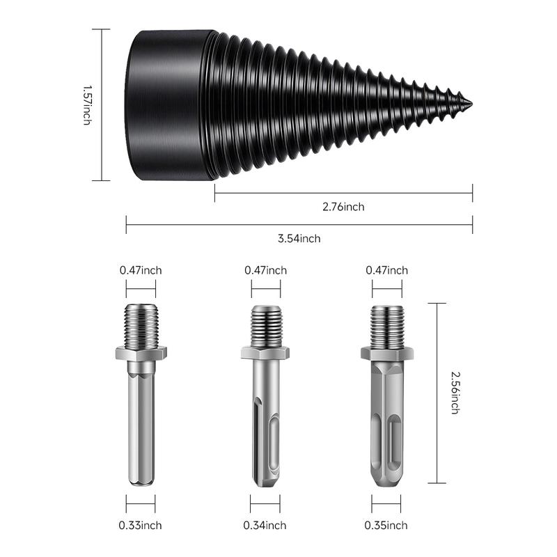 Elevate your wood splitting with this heavy-duty carbon steel cone. Perfect for fireplace, camping, home heating, and outdoor cutting. This set includes a round, hex, and square shank for versatile use. Safe and efficient, it simplifies wood splitting tasks. Ideal for those seeking a reliable tool for various applications.