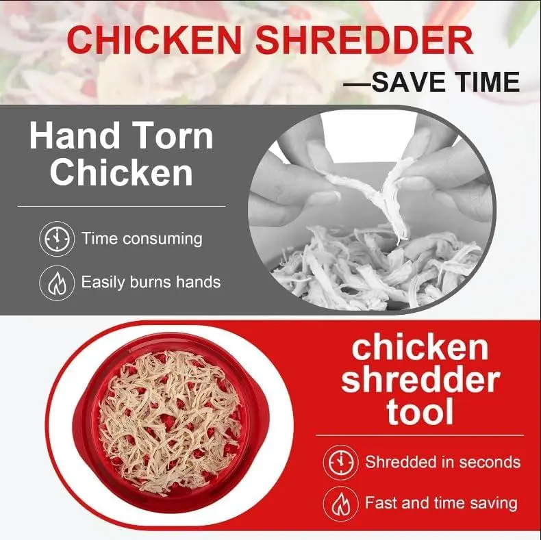 🌟 Versatility 🌟- Shreds chicken, pork, beef, and vegetables.- Ideal for tacos, quesadillas, BBQ pork, tuna salad, buffalo chicken salad, casseroles.- Great for pet food preparation.