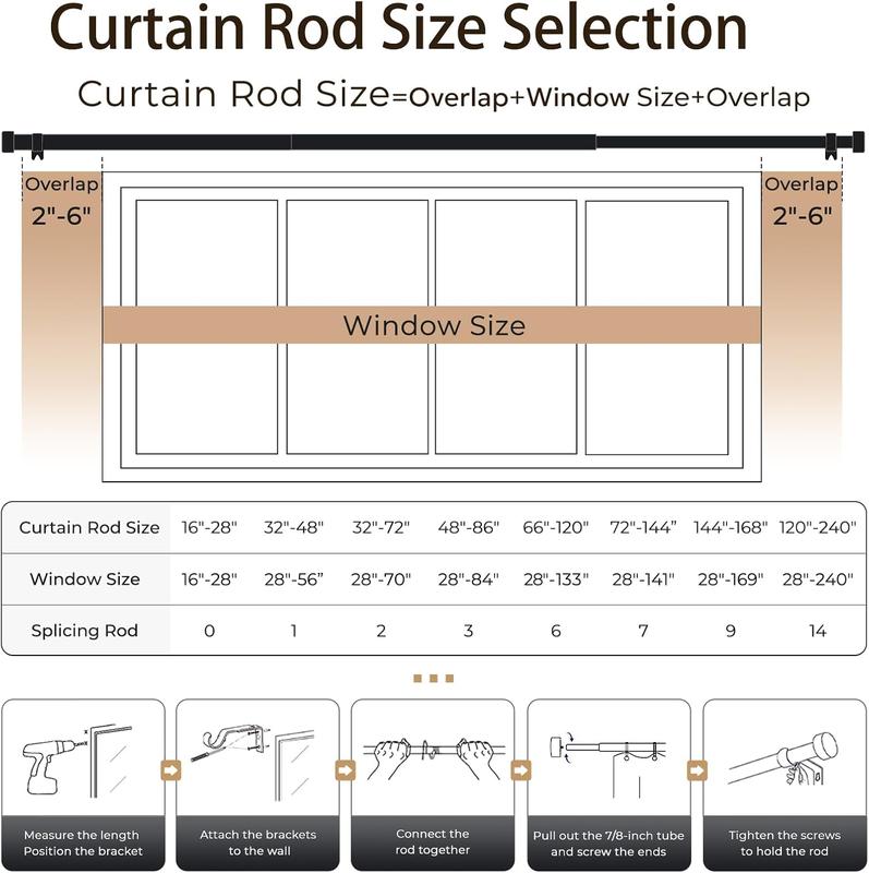·EASY TO ASSEMBLE: Our adjustable curtain rods for window contains all kinds of parts needed for assembly, and it can be easily assembled in just a few simple steps. The number of parts included in each size is different, please refer to the detailed photos for details.