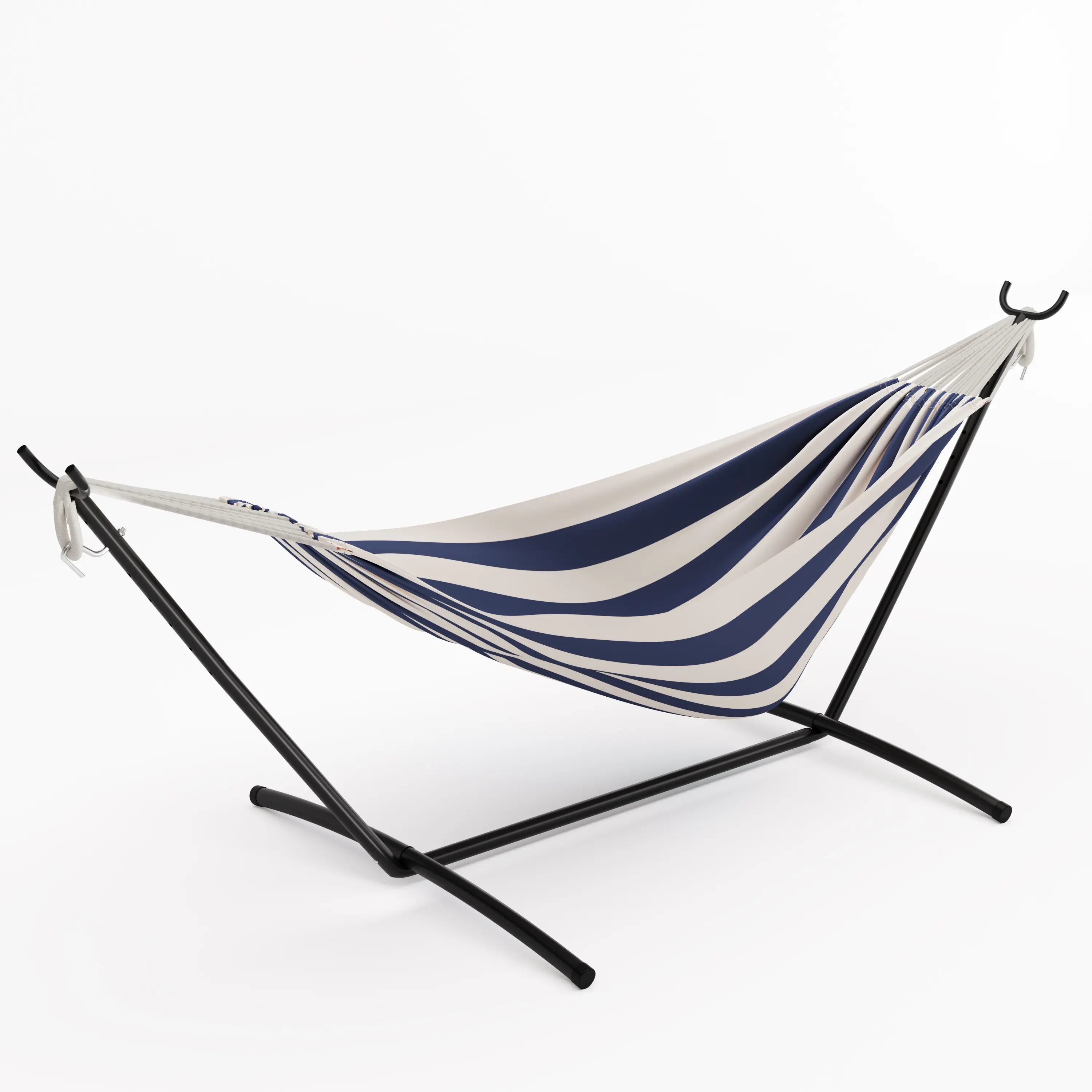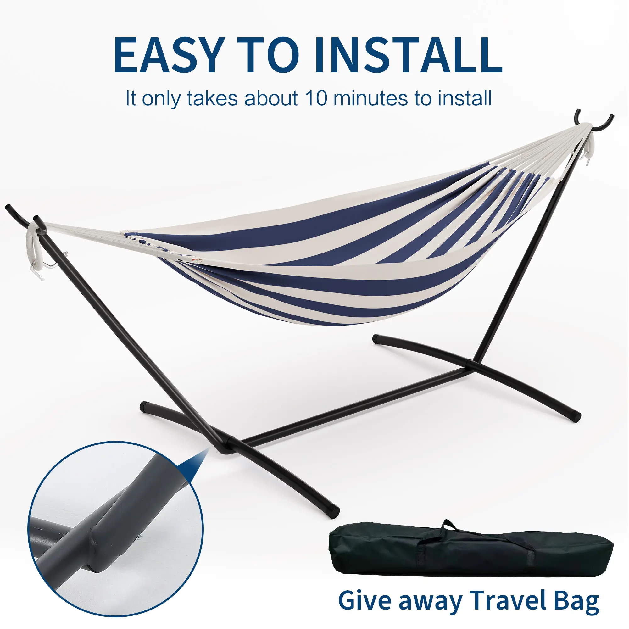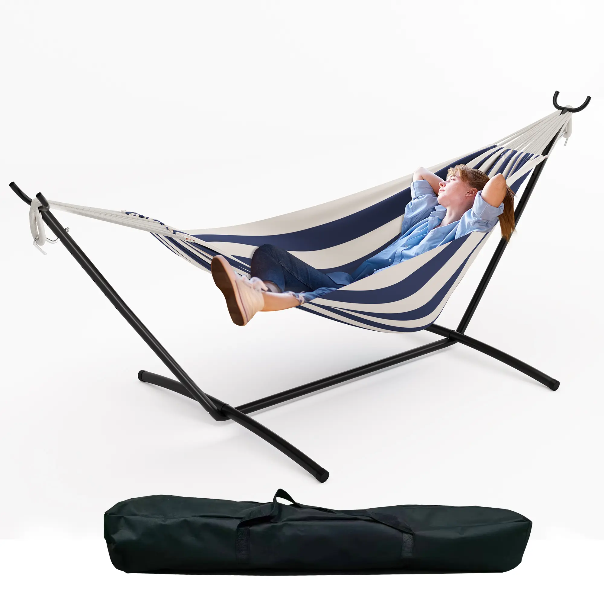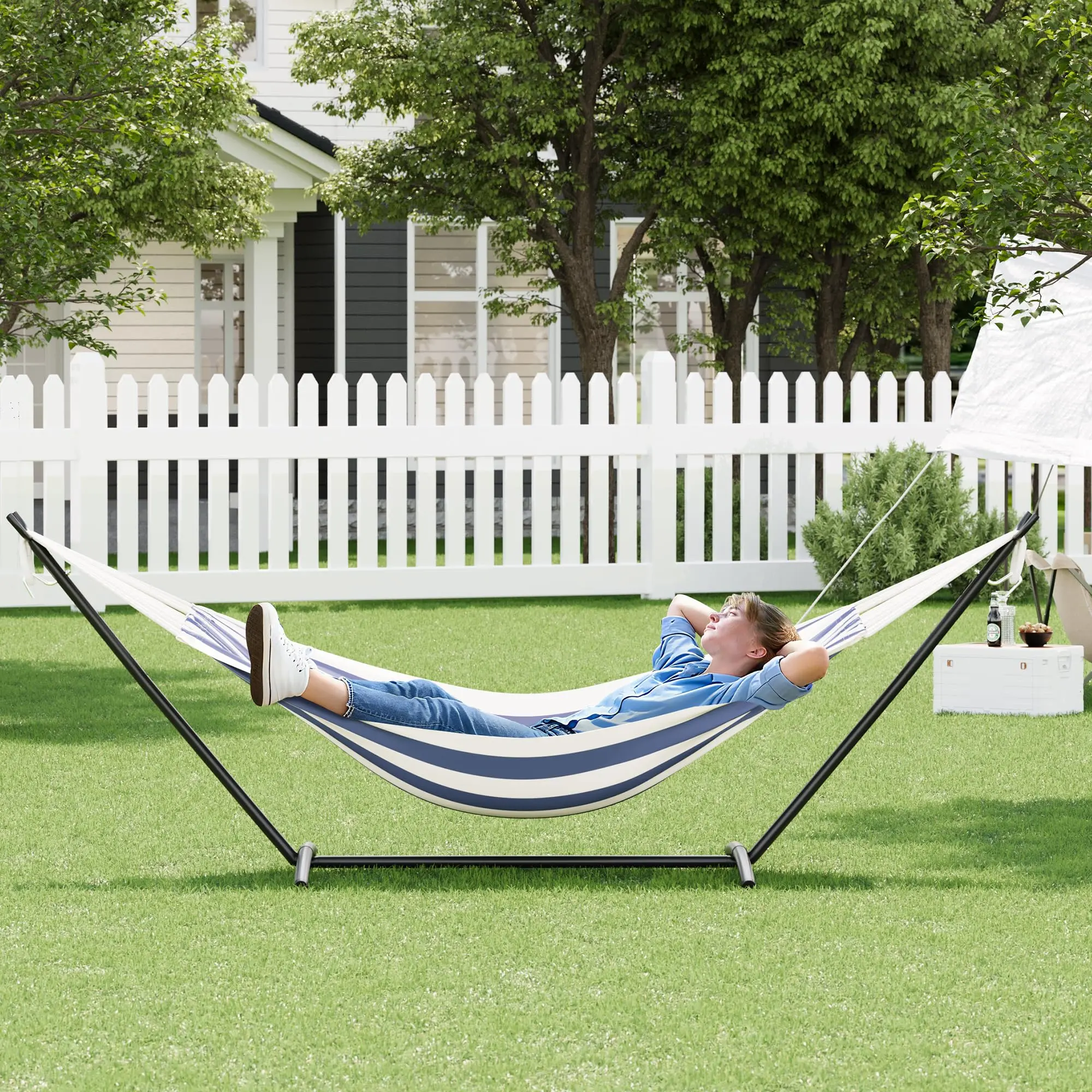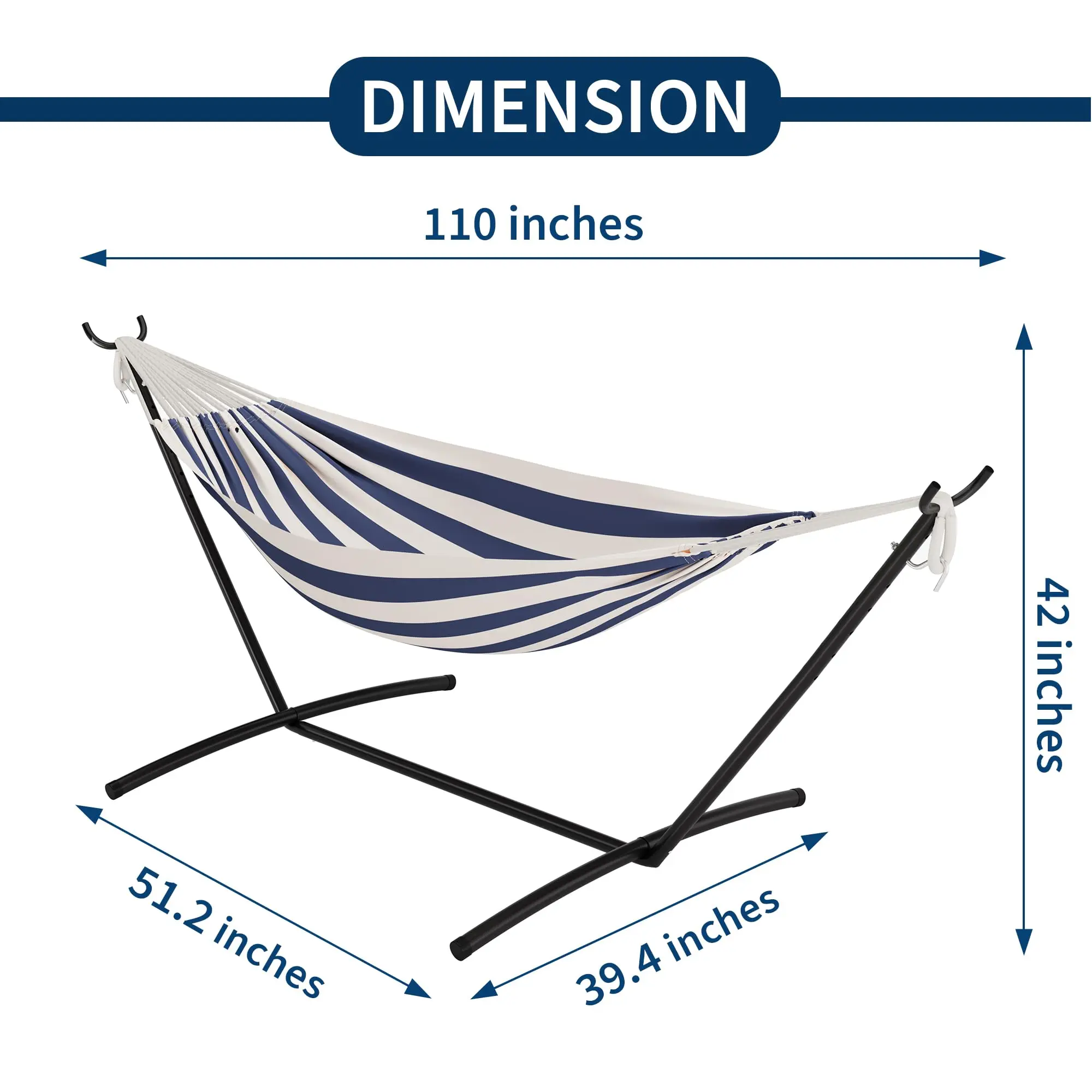 ·1.Authentic Brazilian-Style Double Hammock: lively stripes and a sleek steel stand bring exotic flair and comfort to your patio, garden, or backyard.