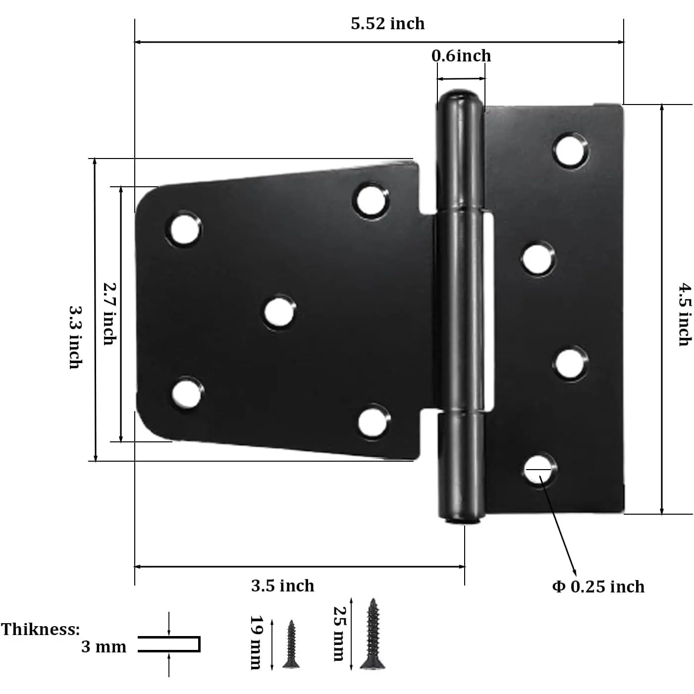 • Pack Contents: Includes 2 black gate hinges, 18 pcs 20 mm screws, and 18 pcs 25 mm screws. The swing part measures 3.5 inches x 3.3 inches, and the fix part is 1.8 inches x 4.5 inches, with a thickness of 1.2 inches. 📏
