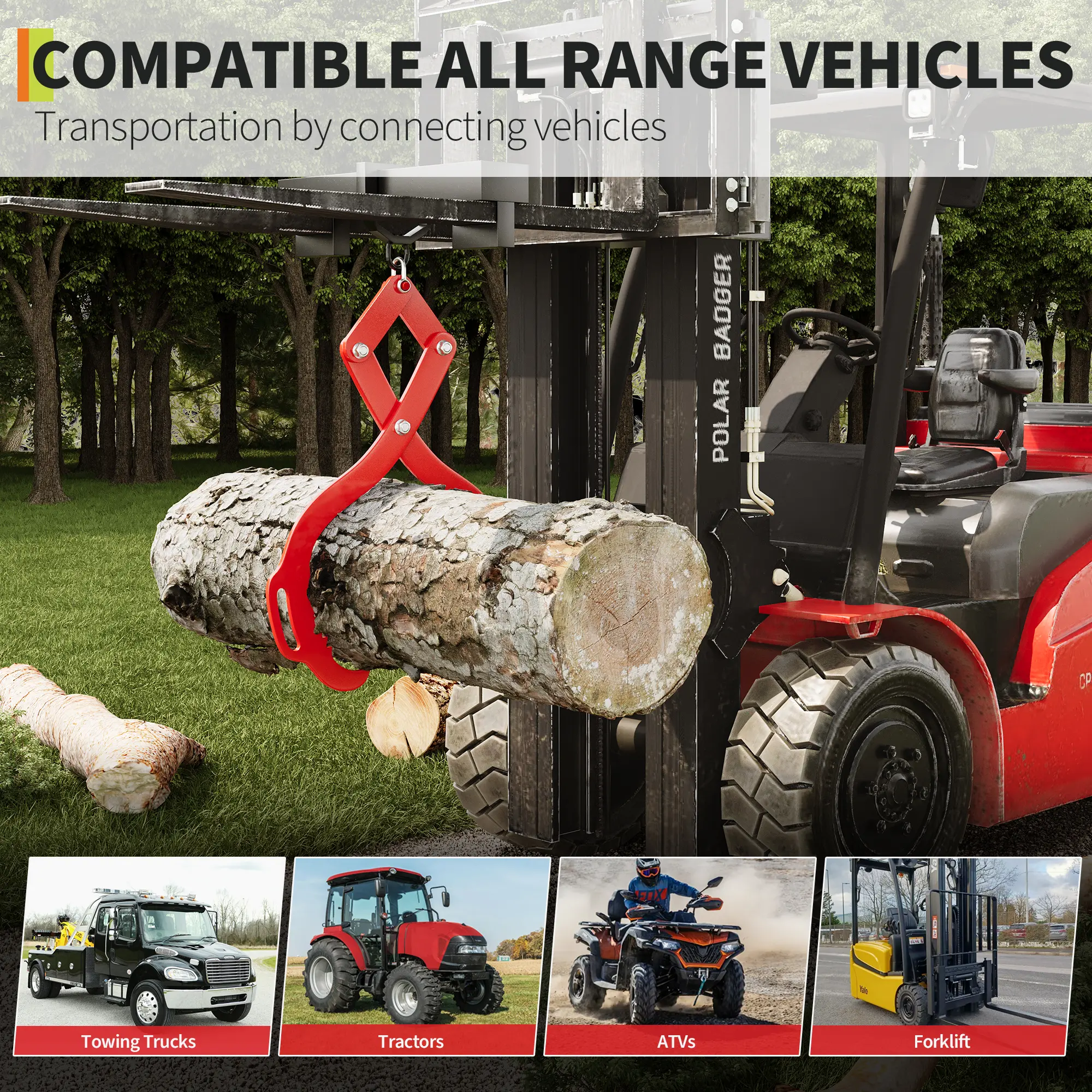 ·.Integrated suspension loop allows easy attachment to tractors, ATVs, trucks, and other equipment for safe, efficient log handling.