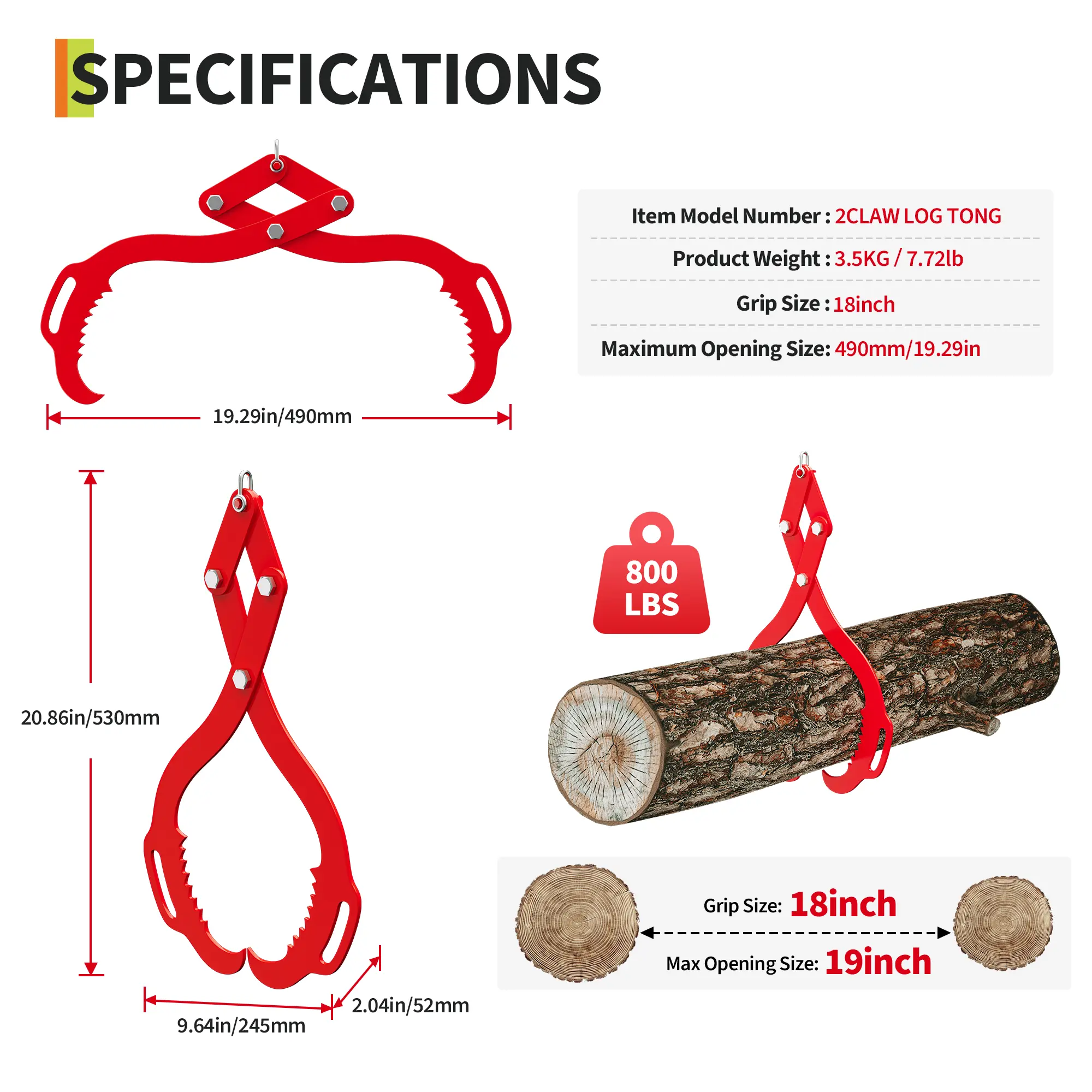 Heavy Duty 18 Inch Log Lifting Tongs, 2 Serrated Claw Hooks, 2200LBS Steel Swivel Grapple, Logging Tool for Wood, Lumber Skidding, Tractors, Trucks, Forestry Equipment