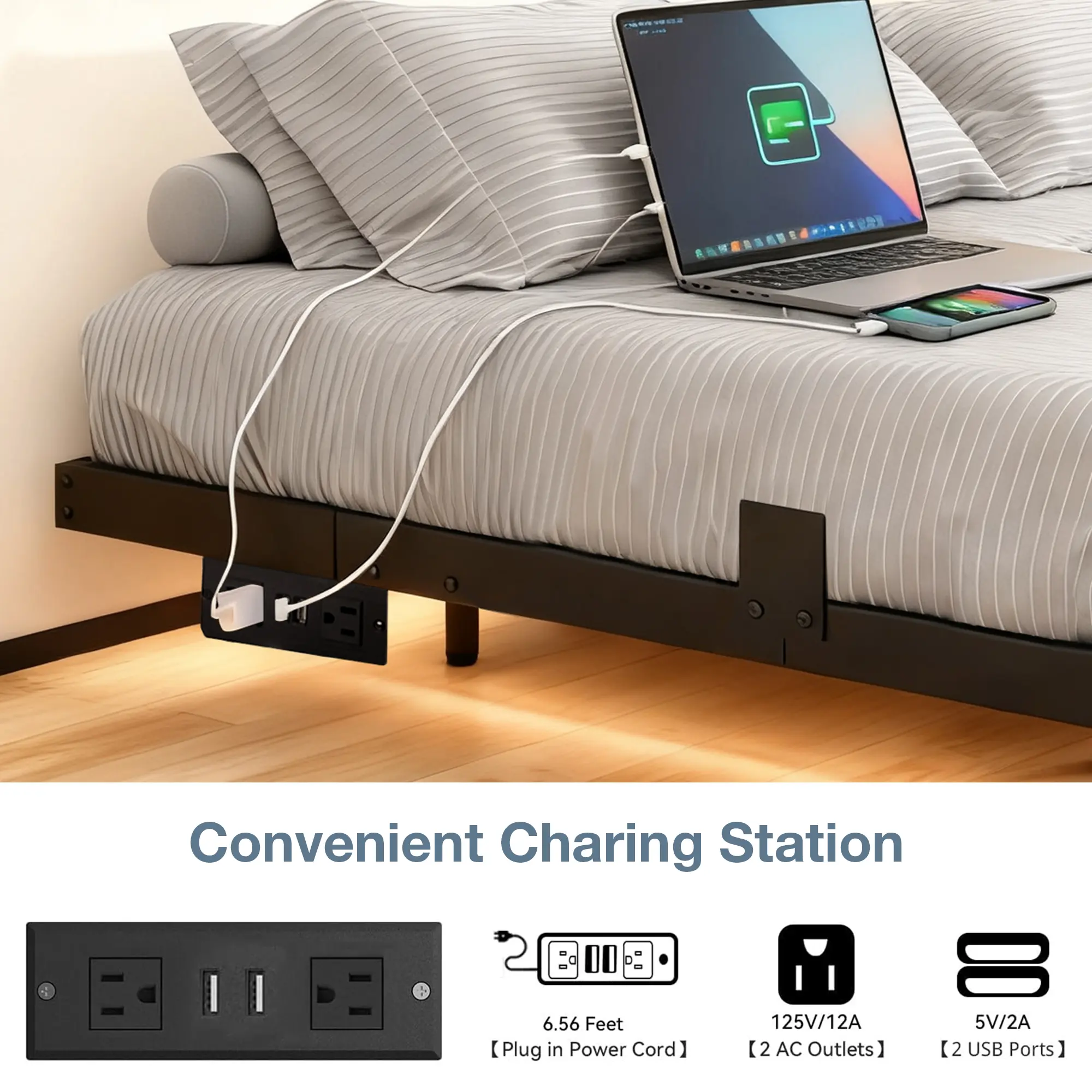 3. Convenient Side Socket with Multiple Interfaces: Say goodbye to the trouble of finding a power outlet far away! This iron bed frame is equipped with a side socket featuring 2 USB ports and 2 three-prong outlets. You can easily charge your phone, tablet, laptop or other electronic devices while lying on the bed, making it extremely convenient for daily use.