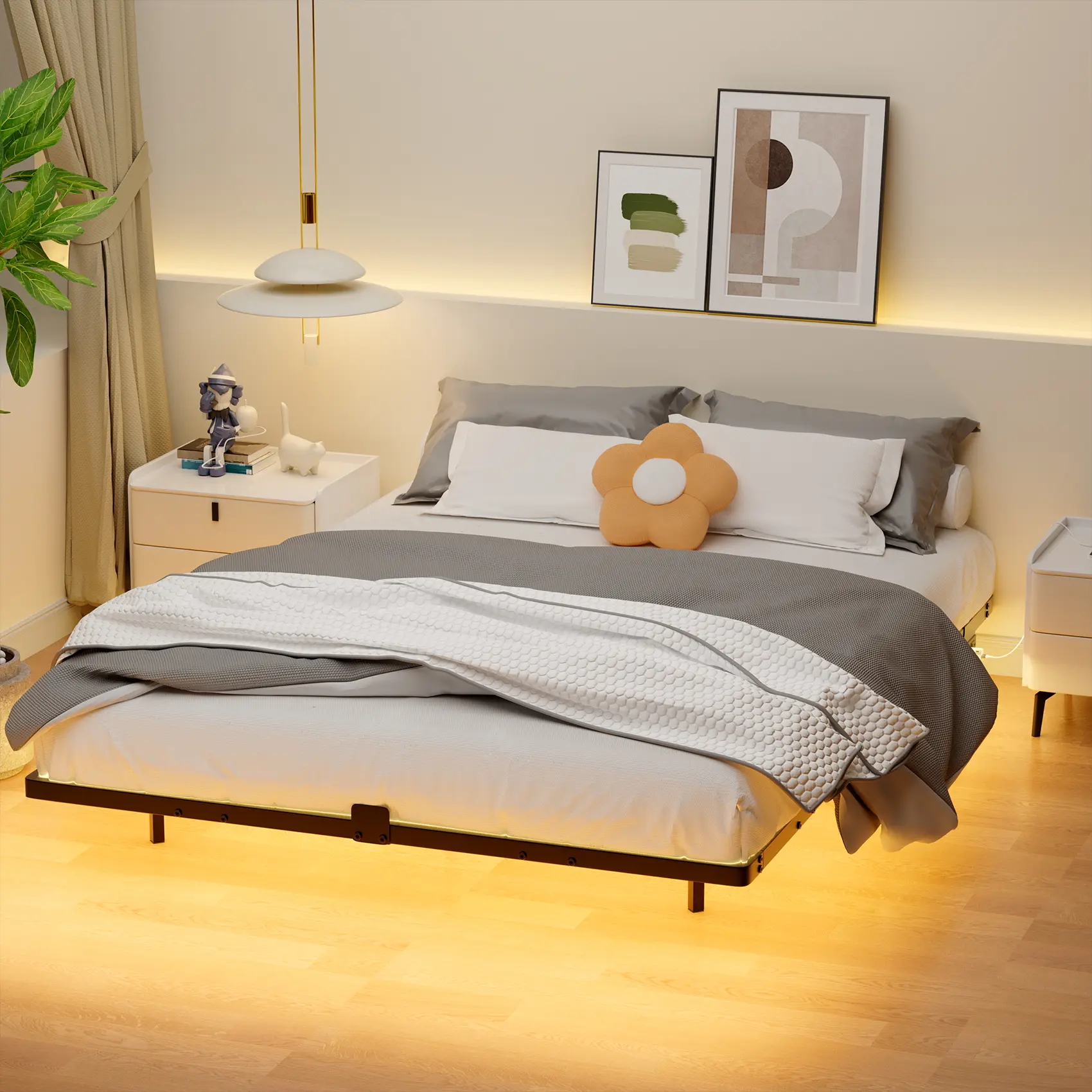 2. Built-in LED Strip for Ambient Lighting: Equipped with a premium LED light strip at the bottom of the bed frame, this product creates a warm and cozy atmosphere in your bedroom. Whether you're reading a book before bed, getting up at night or simply wanting to enhance the room's aesthetics, the soft light from the LED strip provides just the right amount of illumination without being harsh on the eyes.
