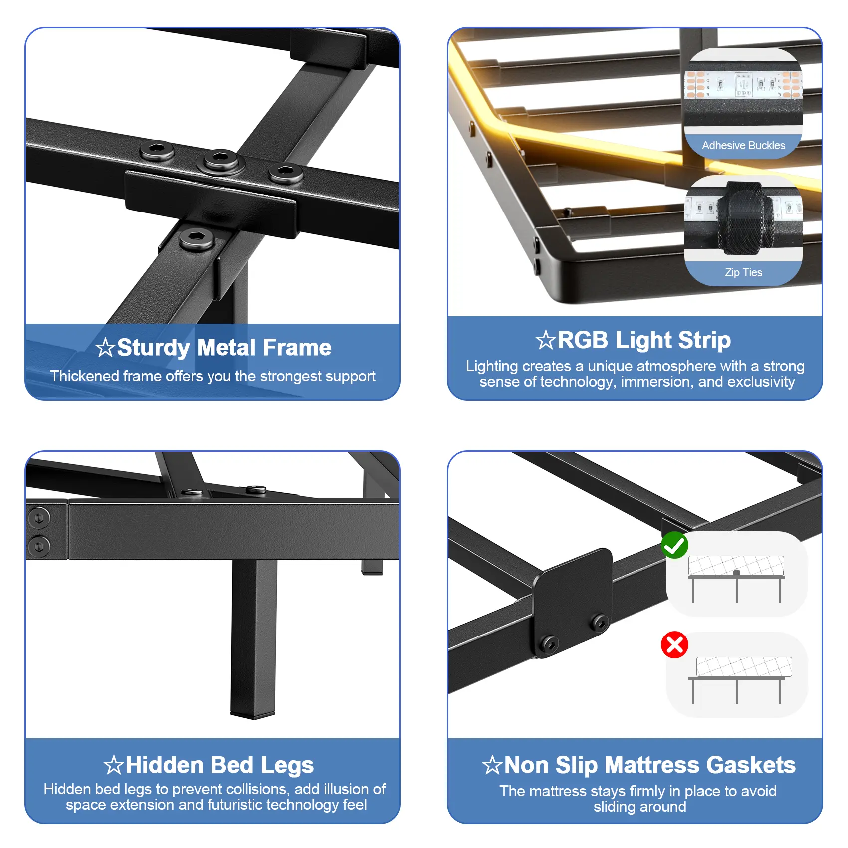 【Super Load-bearing Capacity】Made of high-strength steel, our bed frame is capable of supporting up to 300 pounds, ensuring your safe and stable sleep without the need for a box spring. It is perfect for use in guest rooms, rentals, or as the primary bed in your own room.