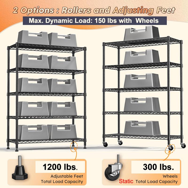 ·【Garage Shelving with Large Storage】5 Tier wire shelving rack measures 35.4"Wx15.7"Dx76.1"H. 5 layer wire shelving unit have huge storage space. Box, appliances, kitchen supplies, books, clothes or anything you'd like to keep organized and accessible can be placed on this storage shelves. The garage shelving doesn't occupy too much space, but it can create more additional space