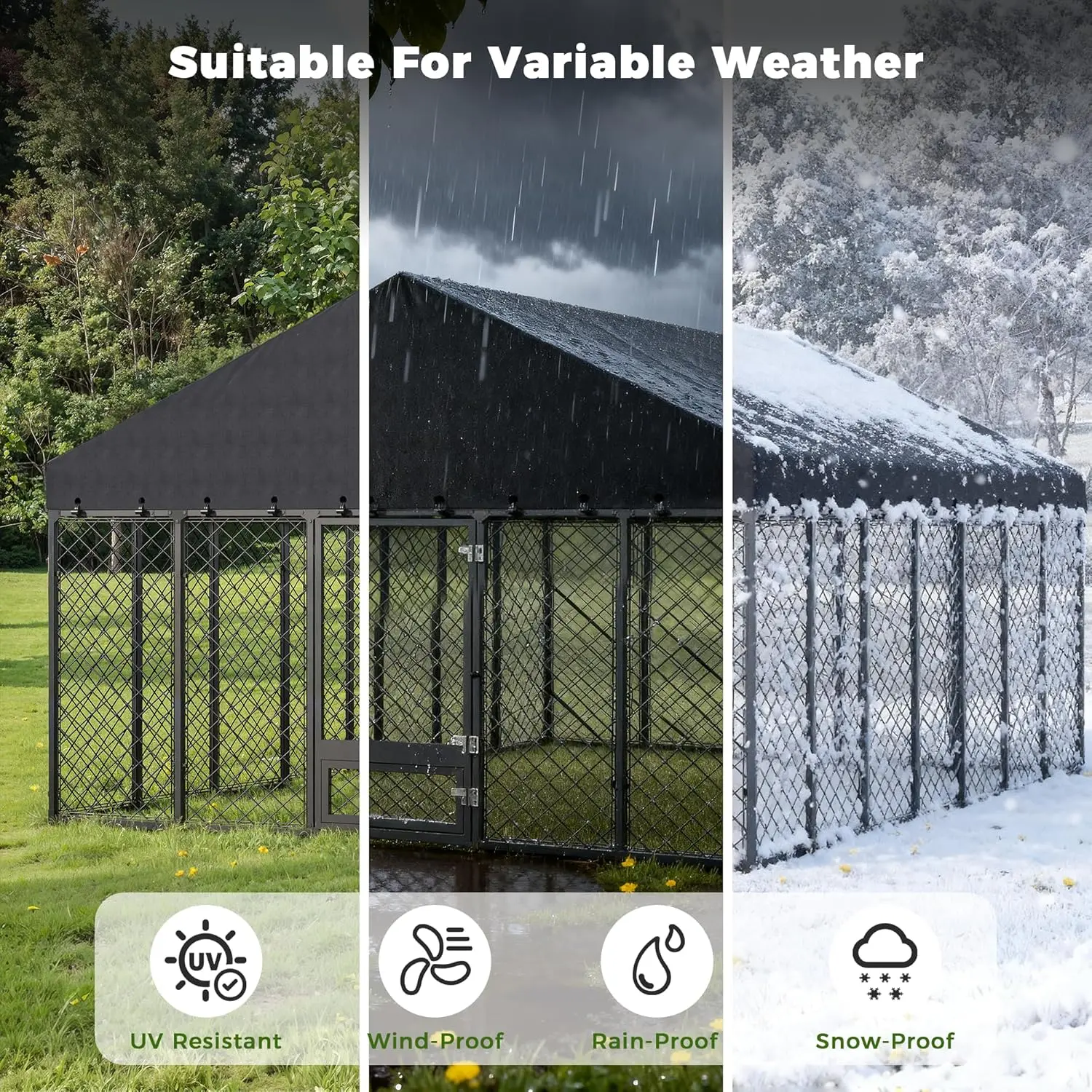 ALL-WEATHER WATERPROOF ROOF & UV PROTECTION: The outdoor kennels for large dogs features a durable, tear-resistant premium roof cover that provides complete shelter from rain and sun. This waterproof dog kennel roof offers shade and keeps your pet dry, making it a reliable all-weather outdoor dog enclosure.
