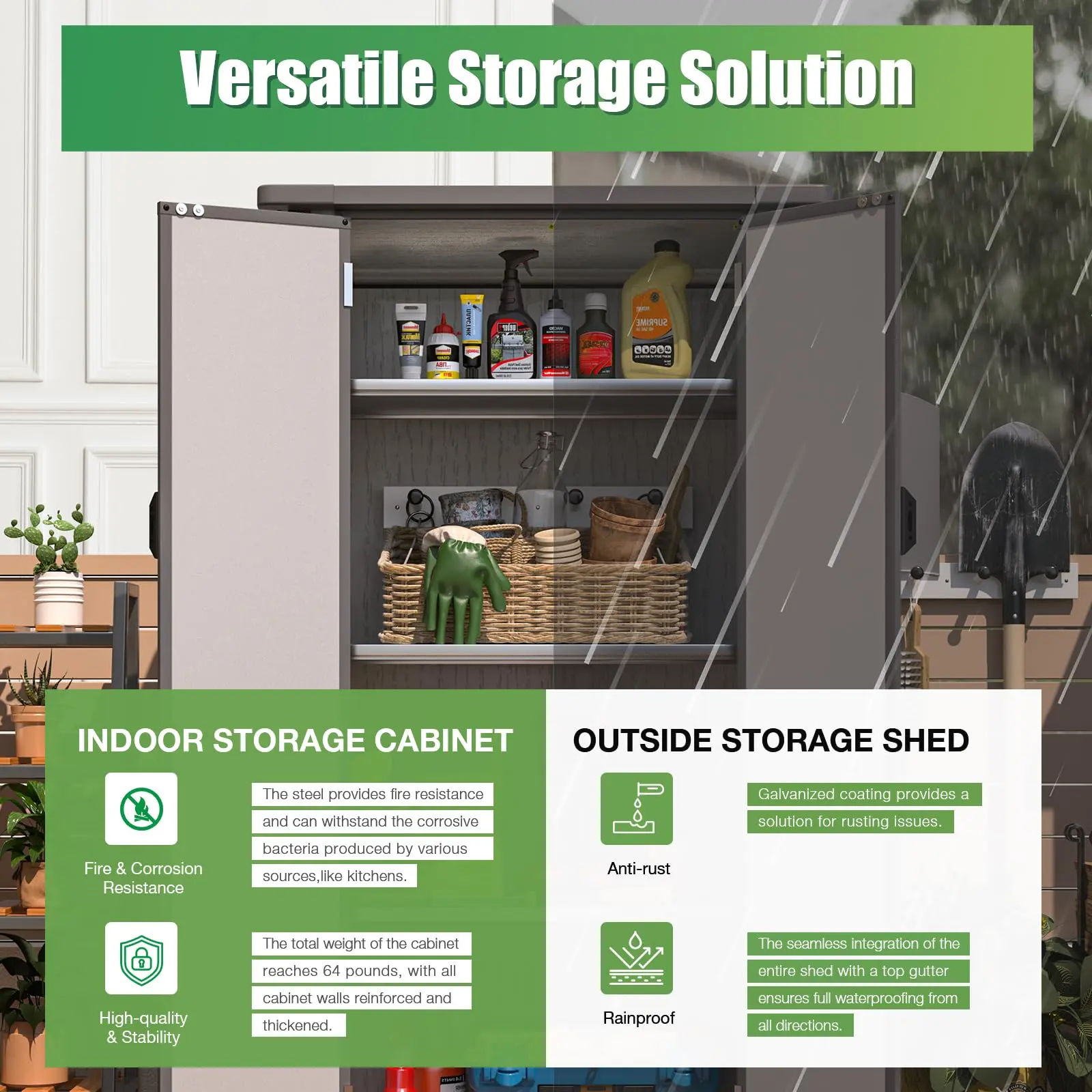 ·Durable & Waterproof Resin Construction:Made from high-quality, UV-resistant resin, this cabinet is built to last. It offers excellent waterproofing and requires only simple wiping for cleaning. The material also resists fading, maintaining its appearance even with long-term outdoor use.