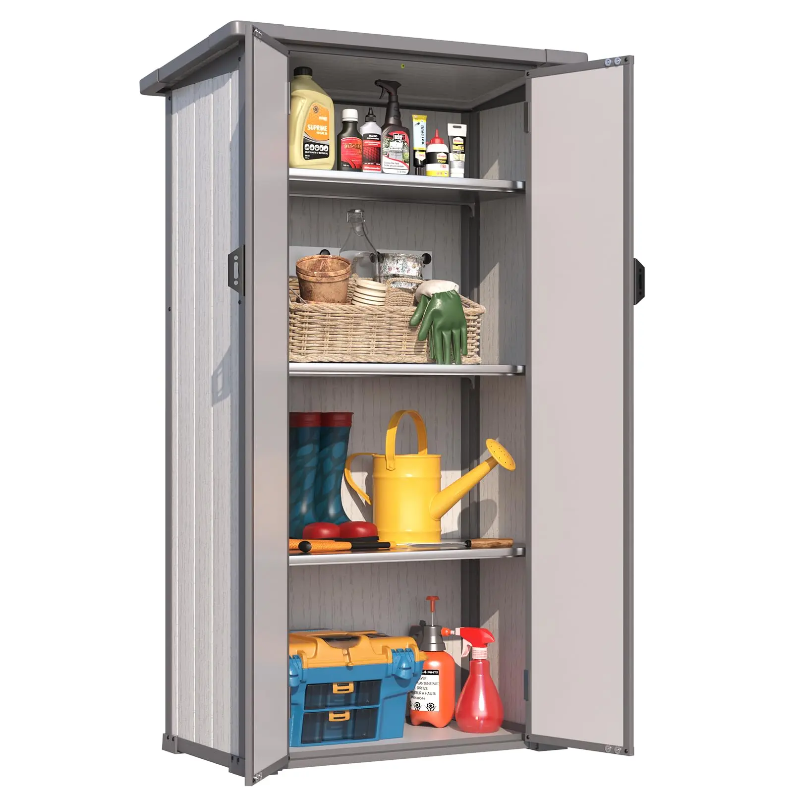 ·Customizable 3-Tier Storage:Equipped with 3 adjustable shelves, this cabinet lets you customize the interior layout to fit everything from bulky outdoor tools to daily essentials. The flexible design ensures optimal organization for any storage need.