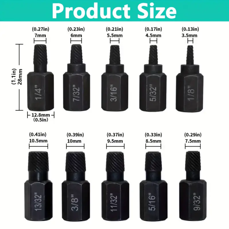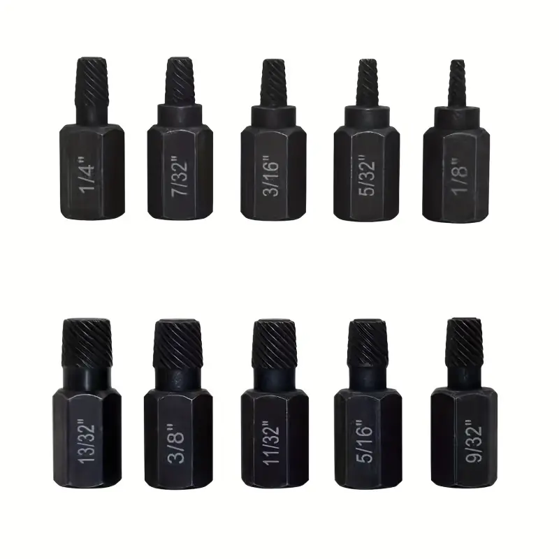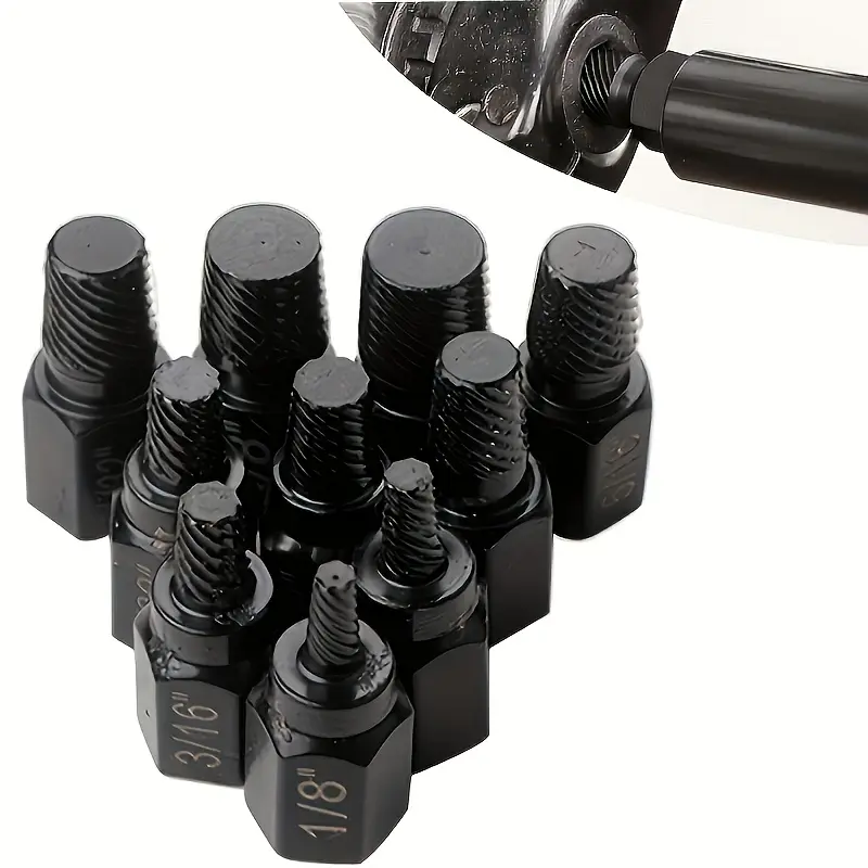 10-Piece Heavy-Duty Thread Extractor Set Easily remove damaged, stripped, or broken bolts, hex screws, and fasteners. High-strength construction, durable and long-lasting.