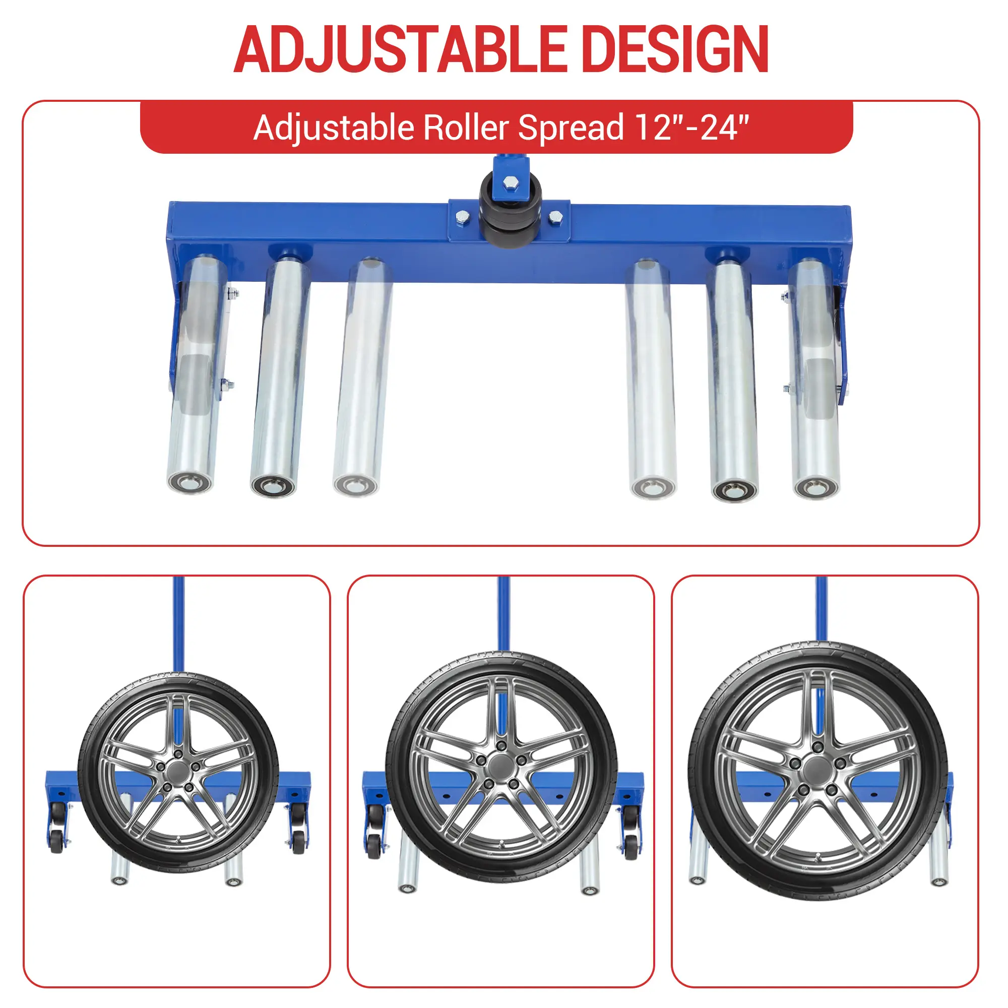 The adjustable rollers feature three different positions to ensure a secure fit for various tire sizes.