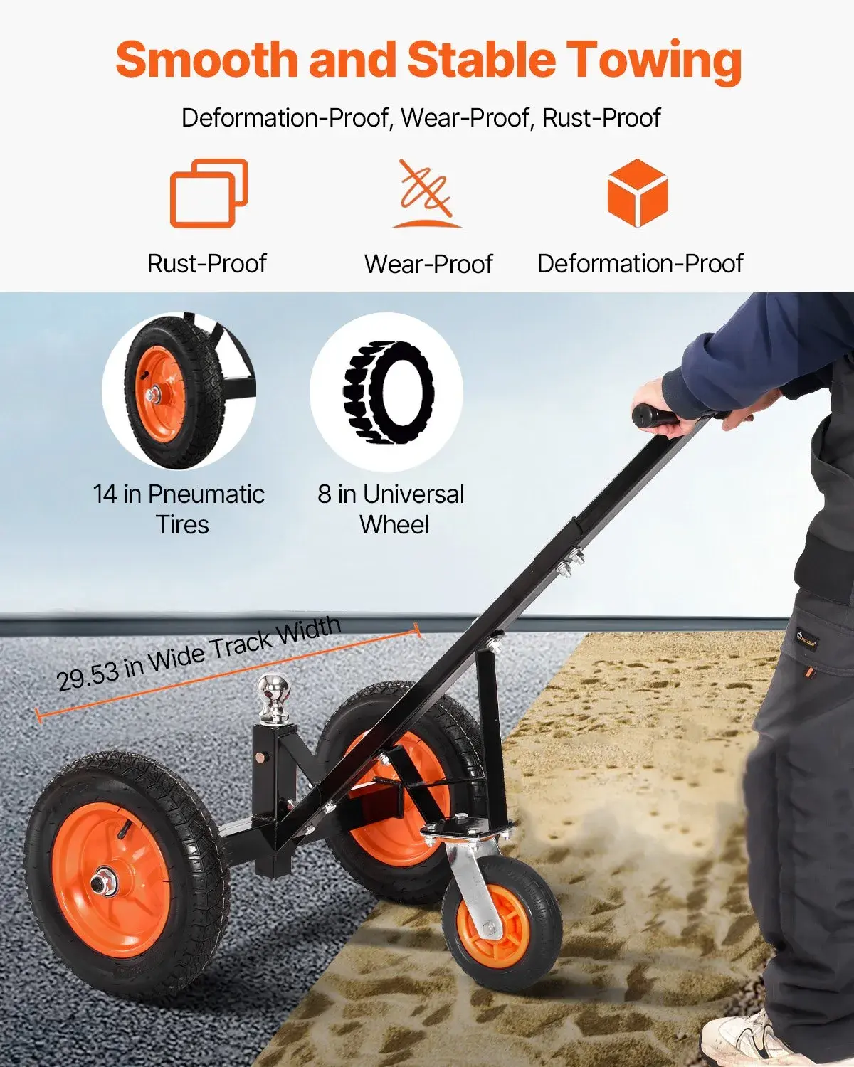 ·Stable Movement: Equipped with an 8.5-inch pneumatic rubber tire, our trailer mover dolly provides excellent traction and stability on smooth cement roads, grass, uneven terrains, and sandy surfaces. The tire is also wear-resistant and shock-absorbent, providing a comfortable and safe towing experience