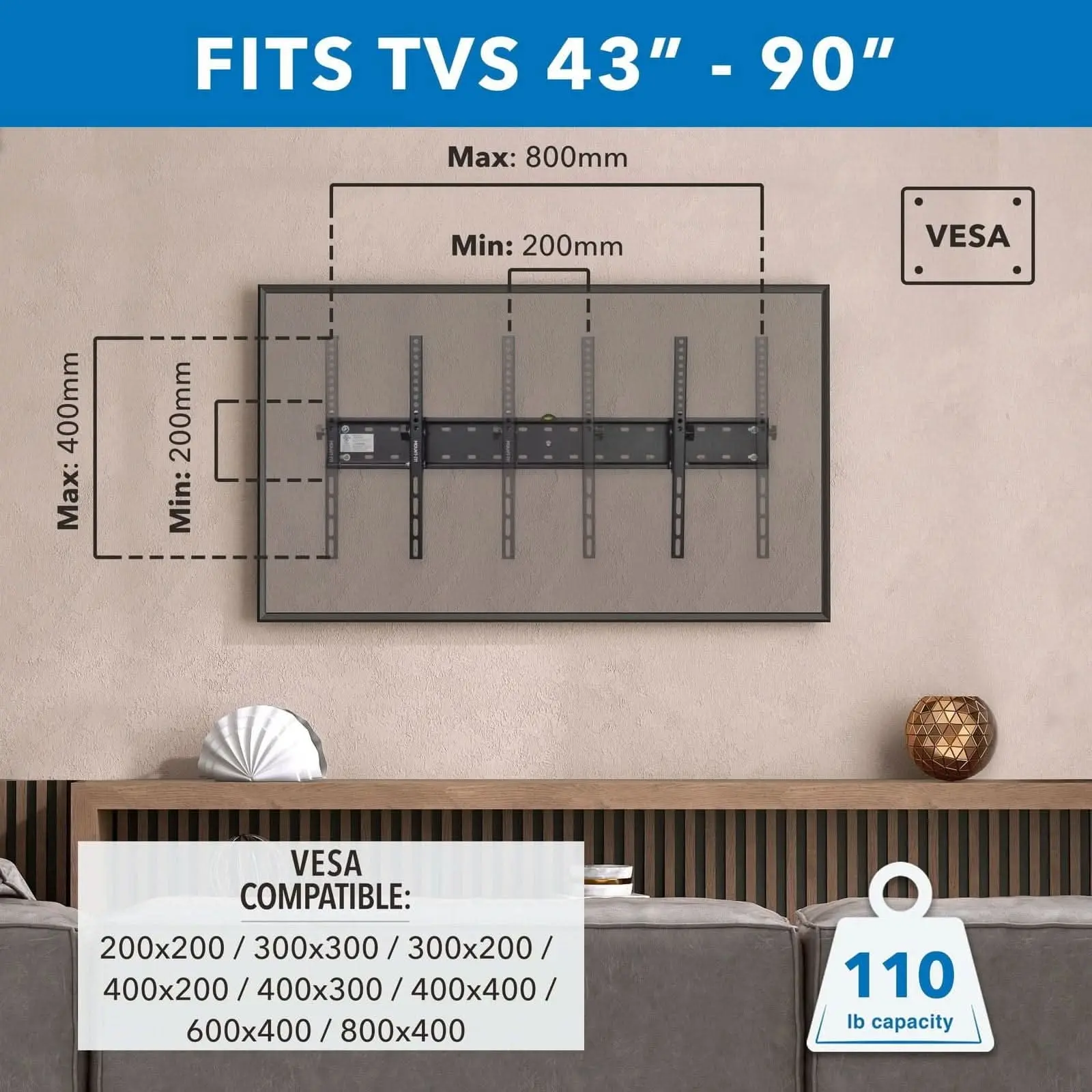 ·Compatibility: Fits TVs 43" to 90" and up to 110 lbs, including curved screens.