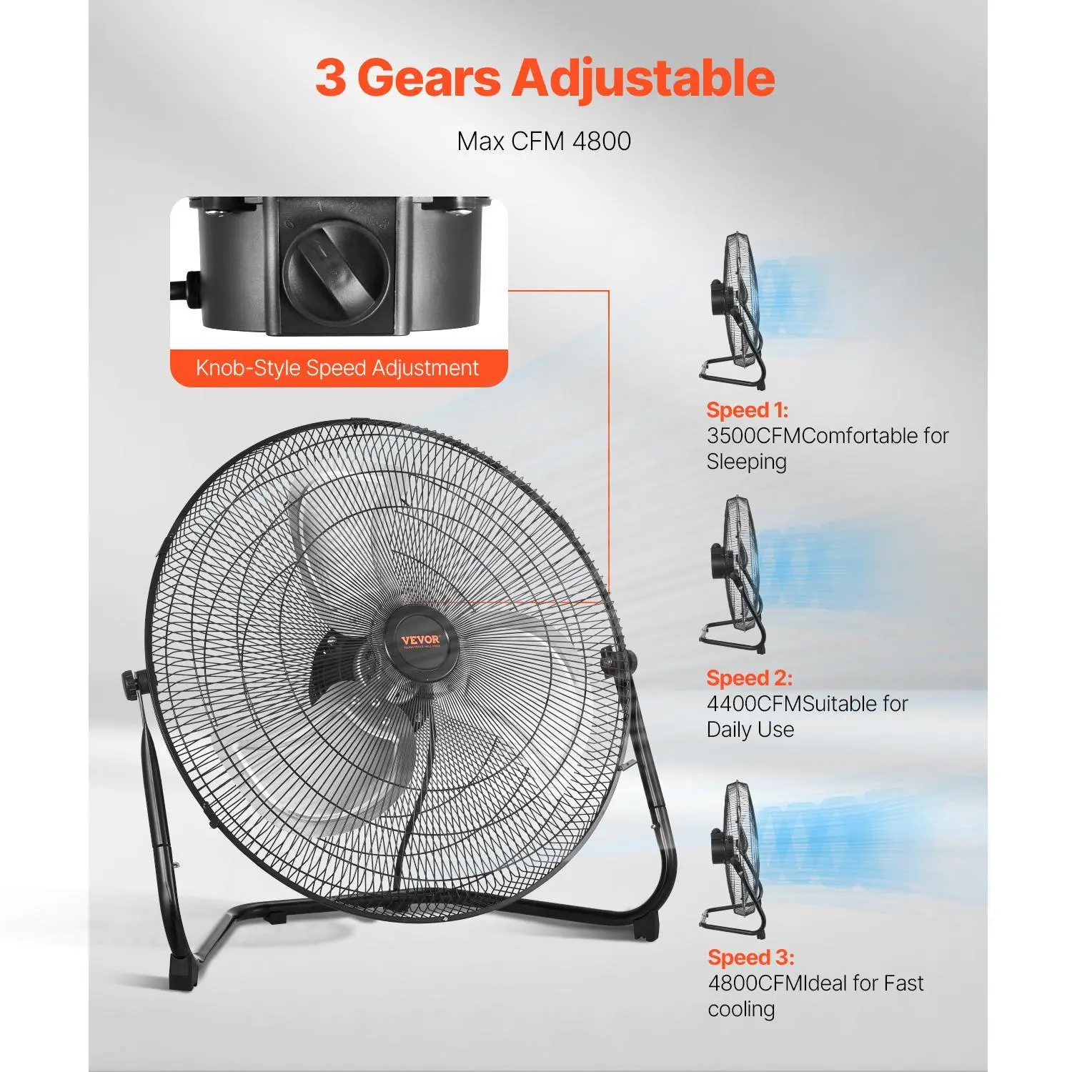 • High-Speed, Low Noise: Our high velocity floor fan features a 3-speed dual ball-bearing motor, delivering up to 4800 CFM airflow with an outstanding air throw of 22.97 ft and remarkable wind speed at 21.33 ft/s. Besides, the max noise is below 65 dB(A), ideal for rapid but not loud cooling.